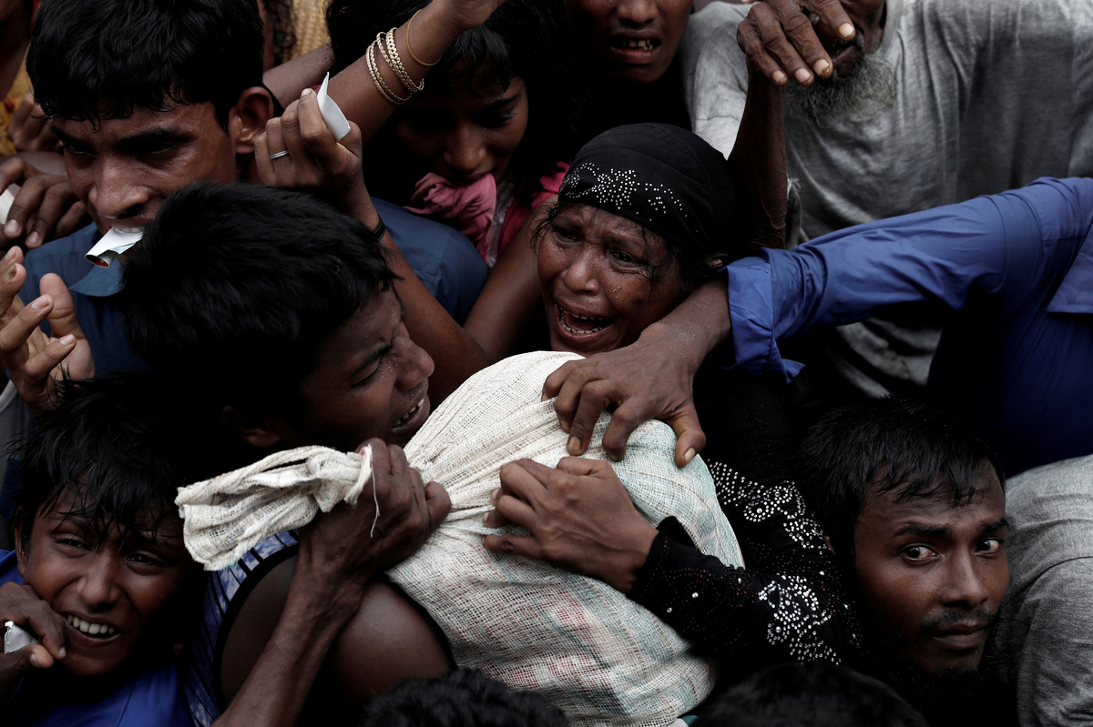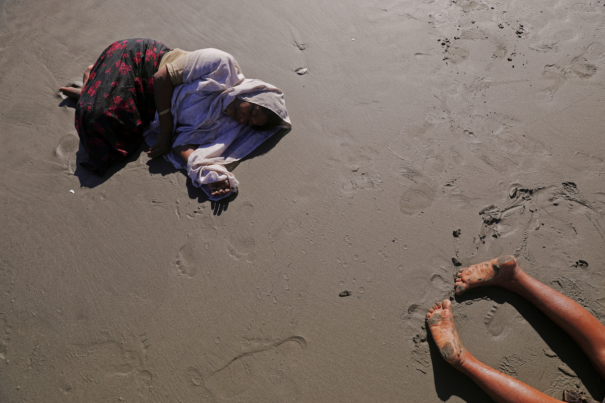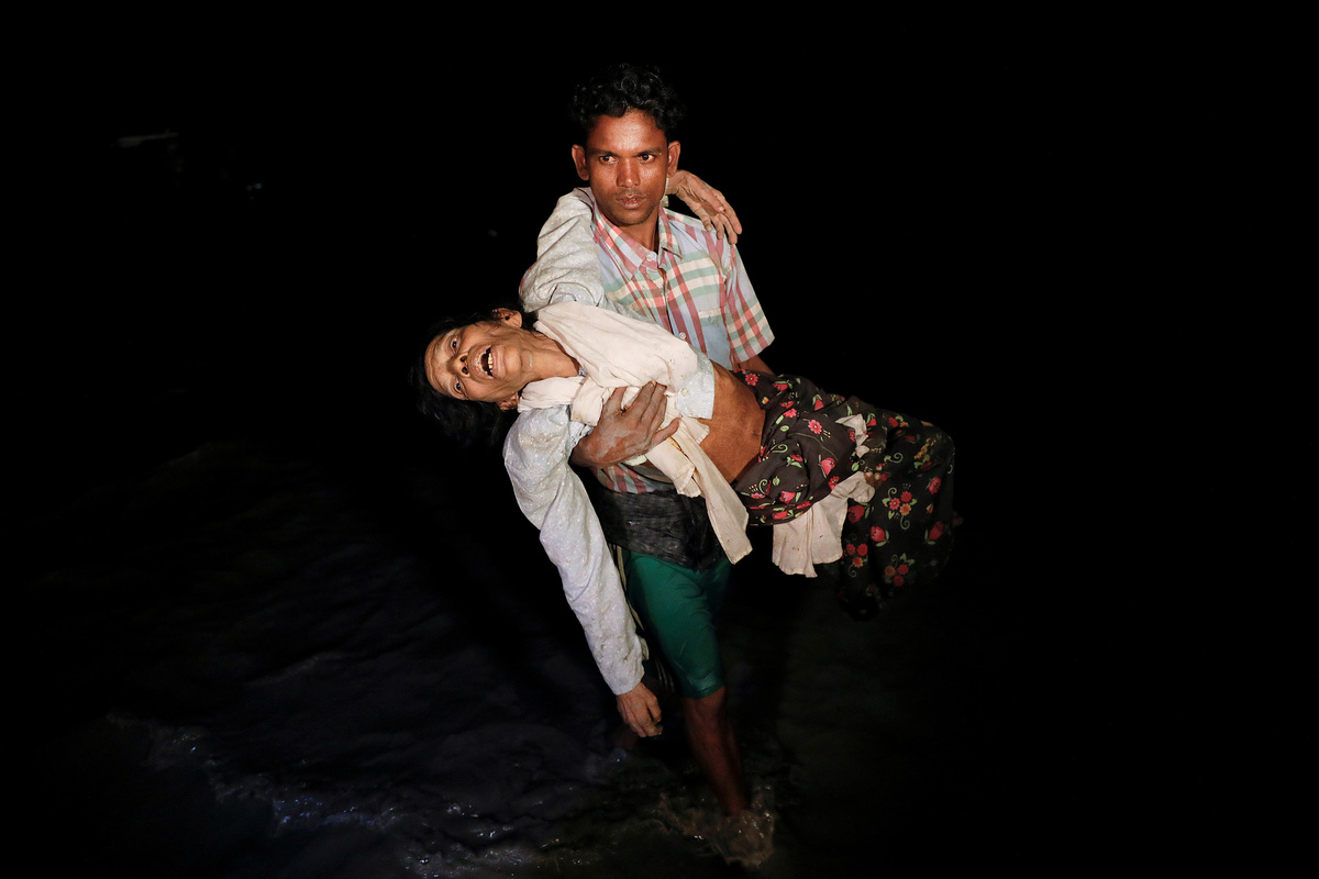 Rohingya refugees collapse from exhaustion after they arrive by a small wooden boat from Myanmar to the shore of Shah Porir Dwip, in Teknaf, near Cox's Bazar in Bangladesh, October 1, 2017. Reuters photographer Damir Sagolj: "Unlike those who were crossing the Naf River under the cover of the darkness, this group of Rohingya refugees were landing at the beach of Shah Porir Dwip in the broad daylight. They were totally exhausted - I could only imagine what these people had been through before the rickety vessel brought them to Bangladesh. After landing, many just collapse. But not much later, as if awoken by survival instinct, they got back on their feet, collected children and the few possessions they brought with them, and continued by foot towards the refugee camps, a safe haven for those fleeing danger in Myanmar." REUTERS/Damir SagoljAn exhausted Rohingya refugee woman touches the shore after crossing the Bangladesh-Myanmar border by boat through the Bay of Bengal, in Shah Porir Dwip, Bangladesh September 11, 2017. Reuters photographer Danish Siddiqui: "It was a clear morning and I could see the several clouds of smoke in the background on the Myanmar side. After a few hours waiting on the beach the fishing boats started arriving with Rohingyas. This image was taken just after a family member of the Rohingya woman carried her from the boat. The exhausted Rohingya woman sat on the beach and put her hand to feel the shore after the long and dangerous journey from Myanmar." REUTERS/Danish SiddiquiArif Ullah, who said his village was burnt down and relatives killed by Myanmar soldiers, comforts his wife Shakira who collapsed from exhaustion as Rohingya refugees arrive by a wooden boat from Myanmar to the shore of Shah Porir Dwip, in Teknaf, near Cox's Bazar in Bangladesh, October 1, 2017. Reuters photographer Damir Sagolj: "That morning, a group of Rohingya refugees crossed the Bay of Bengal on a rickety, wooden boat, for landings at Shah Porir Dwip, a village at the mouth of the Naf River. Most of the refugees, exhausted from the trip, collapsed after finally reaching the shores of Bangladesh. Shakira, unable to stand on her own, rested in her husband's arms for some 10-15 minutes before getting up and continuing on foot towards a relief centre nearby." REUTERS/Damir SagoljRohingya refugees carry their child as they swim to cross the Myanmar-Bangladesh border in Palang Khali, Bangladesh, October 9, 2017. Reuters photographer Mohammad Ponir Hossain: "That morning I heard that a couple of thousand people were waiting at no-man's land and many Rohingyas were still crossing the border near Anjuman Para, Cox's Bazar. Myself and another Reuters photographer Jorge Silva set off around 11 a.m. There are several paths so we decided to take different routes to try to ensure that at least one of us would get there. There were a few boats available at the location but members of the Bangladesh border guards didn't allow them to use them. The refugees had to swim with their children to make their way to Bangladesh." REUTERS/Mohammad Ponir HossainNobi Hossain wades through the water carrying his elderly relative Sona Banu as hundreds of Rohingya refugees arrive under the cover of darkness by wooden boats from Myanmar to the shore of Shah Porir Dwip, in Teknaf, near Cox's Bazar in Bangladesh, September 27, 2017. Reuters photographer Damir Sagolj: "Dangerously overloaded boats come from the other side of Naf River under the cover of darkness, to avoid coast guards. Everything happens very quickly and in almost total silence - the refugees first help their sick, elderly and children to get off the boats, then everyone wades through the water towards the beach. This man was carrying his relative - an elderly, exhausted woman. After reaching the beach, she was given some help and the family continued towards the relief centre in a local Islamic school in Shah Porir Dwip." REUTERS/Damir SagoljA Rohingya refugee camp in Cox's Bazar, Bangladesh, September 19, 2017. Reuters photographer Cathal McNaughton: "It was important to show the scale of the situation. To show the terrain, the earth where the Rohingya had to live. I waited for the element that would bring all this image together. The person in the bottom left of the frame holds the umbrella in the monsoon rains in an attempt to bring some respite from their situation." REUTERS/Cathal McNaughtonAerial view of a burned Rohingya village near Maungdaw, north of Rakhine State, Myanmar, September 27, 2017. REUTERS/Soe Zeya TunRohingya refugees who fled from Myanmar make their way through the rice field after crossing the border in Palang Khali, Bangladesh October 9, 2017. Reuters photographer Damir Sagolj: "We were covering a tragic accident in which a boat carrying Rohingya refugees capsized and many, mostly children, died when we got a tip from colleagues that two hours drive to the north, thousands of refugees stranded on the border were finally crossing into Bangladesh. I rushed in that direction and made it just before the darkness to witness unreal scenes. Many thousands of people, carrying the sick and injured, the elderly and children, and their few possessions were slowly making their way through the mud and rice fields to the relative safety of Bangladesh. I thought I had witnessed enough tragedy that day for a lifetime, and yet it was just another day in a never-ending story for the Rohingya people fleeing Myanmar." REUTERS/Damir Sagolj