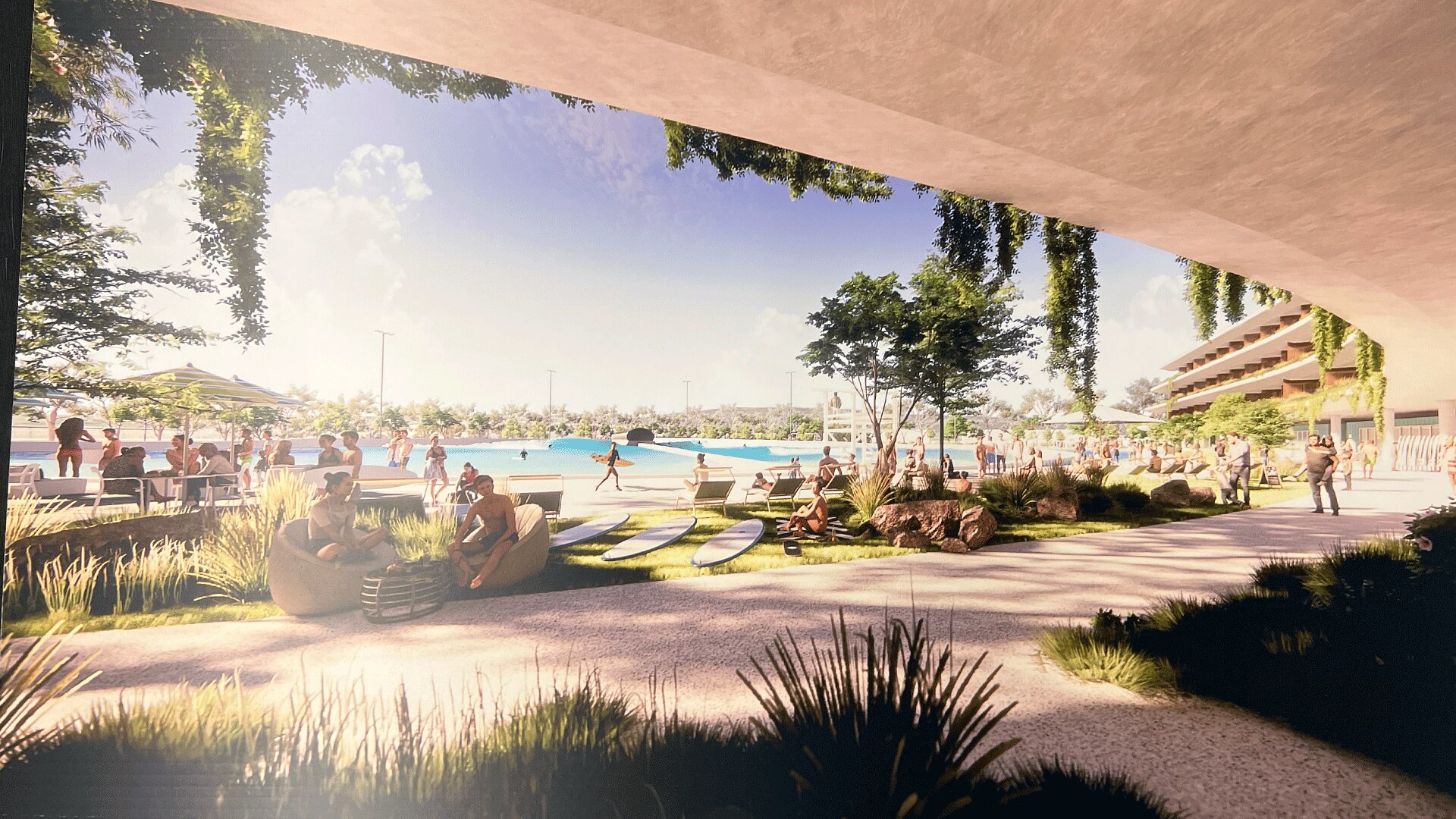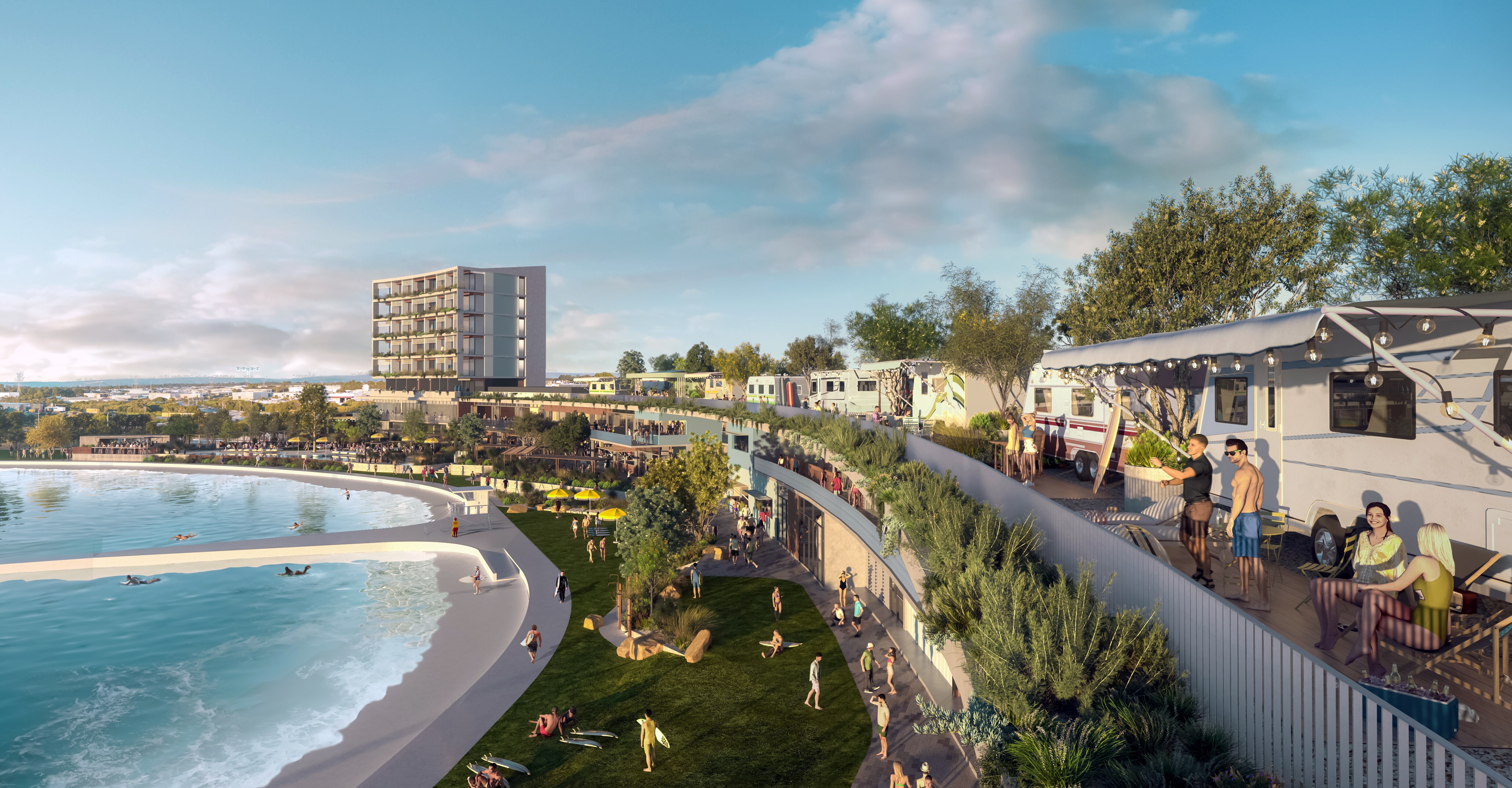 The proposed surf park would have a large open water surfing lagoon, accommodation, bars and restaurants, a function centre, an events space, a skating area, and a health and wellness centre.