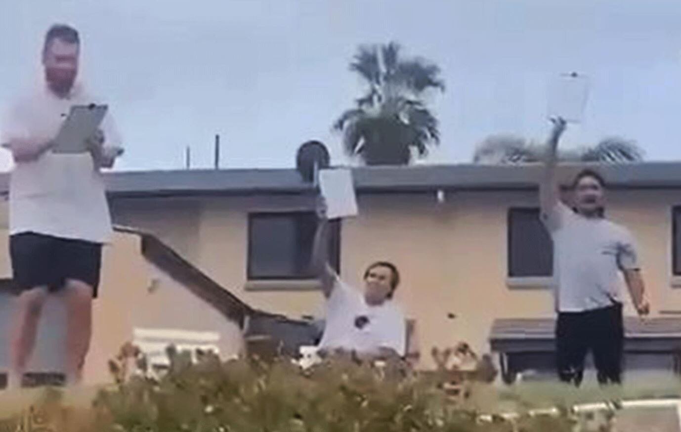 Three men who were holding up numbers rating female joggers out of 10 as they ran past on a public beach have been called out by a woman who filmed the encounter.