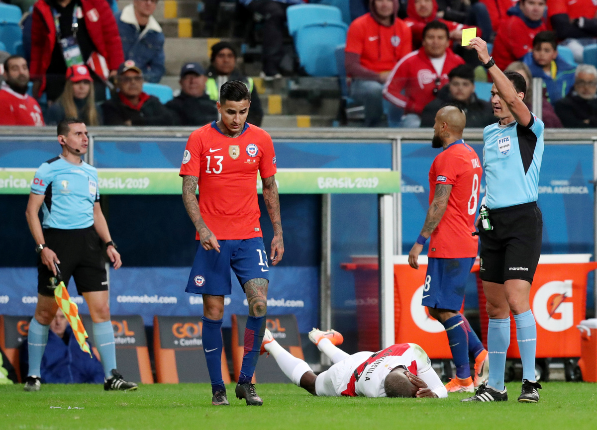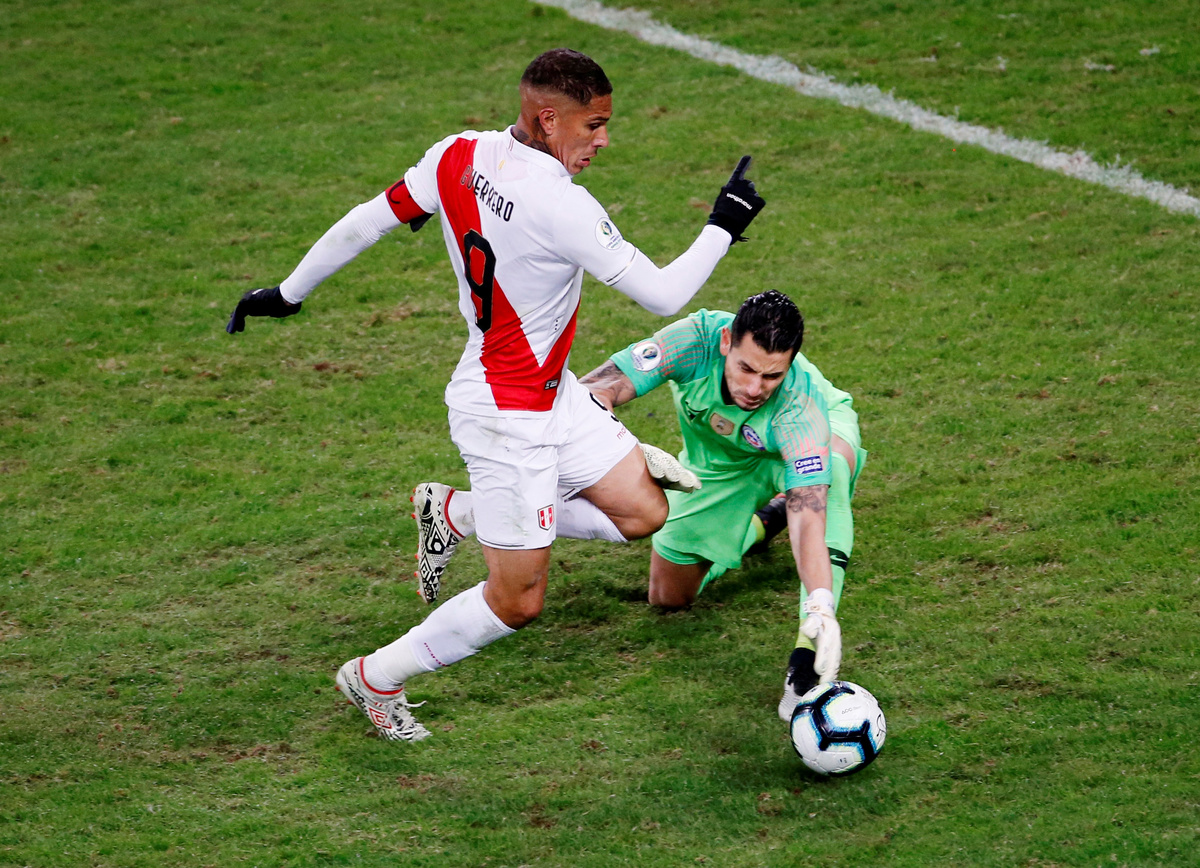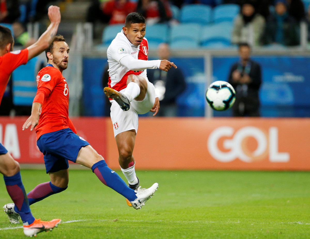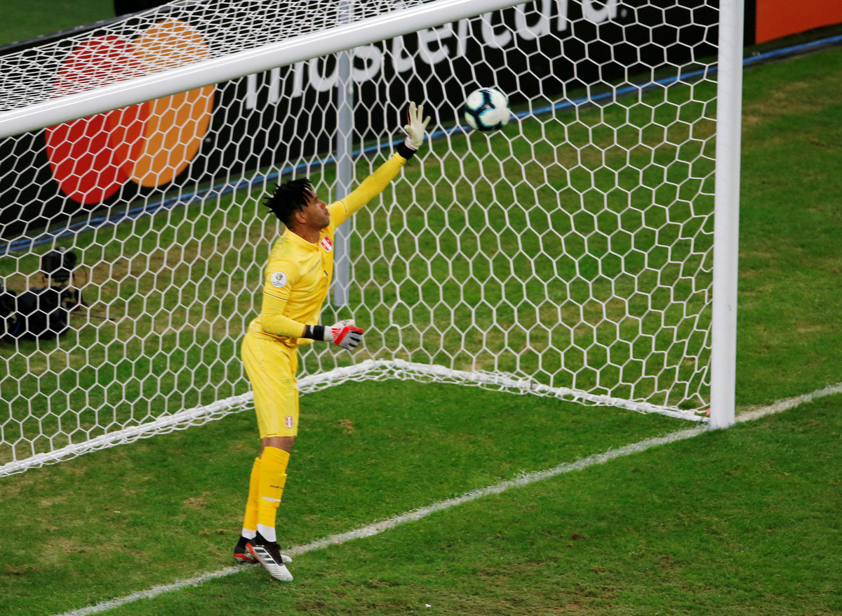 Soccer Football - Copa America Brazil 2019 - Semi Final - Chile v Peru - Arena do Gremio, Porto Alegre, Brazil - July 3, 2019 Peru's Pedro Gallese makes a save REUTERS/Luisa GonzalezSoccer Football - Copa America Brazil 2019 - Semi Final - Chile v Peru - Arena do Gremio, Porto Alegre, Brazil - July 3, 2019 Chile's Erick Pulgar is shown a yellow card by referee Wilmar Roldan REUTERS/Amanda PerobelliSoccer Football - Copa America Brazil 2019 - Semi Final - Chile v Peru - Arena do Gremio, Porto Alegre, Brazil - July 3, 2019 Peru's Paolo Guerrero celebrates scoring their third goal REUTERS/Henry RomeroSoccer Football - Copa America Brazil 2019 - Semi Final - Chile v Peru - Arena do Gremio, Porto Alegre, Brazil - July 3, 2019 Peru's Miguel Trauco and Renato Tapia in action with Chile's Eduardo Vargas REUTERS/Amanda PerobelliSoccer Football - Copa America Brazil 2019 - Semi Final - Chile v Peru - Arena do Gremio, Porto Alegre, Brazil - July 3, 2019 Peru's Victor Yotun celebrates scoring their second goal REUTERS/Ueslei MarcelinoSoccer Football - Copa America Brazil 2019 - Semi Final - Chile v Peru - Arena do Gremio, Porto Alegre, Brazil - July 3, 2019 Chile's Alexis Sanchez in action with Peru's Renato Tapia REUTERS/Henry RomeroSoccer Football - Copa America Brazil 2019 - Semi Final - Chile v Peru - Arena do Gremio, Porto Alegre, Brazil - July 3, 2019 Peru's Edison Flores scores their first goal REUTERS/Diego VaraSoccer Football - Copa America Brazil 2019 - Semi Final - Chile v Peru - Arena do Gremio, Porto Alegre, Brazil - July 3, 2019 Chile's Jean Beausejour talks with Peru's Andre Carrillo REUTERS/Luisa GonzalezSoccer Football - Copa America Brazil 2019 - Semi Final - Chile v Peru - Arena do Gremio, Porto Alegre, Brazil - July 3, 2019 Peru's Edison Flores receives treatment from medical staff after sustaining an injury REUTERS/Diego VaraSoccer Football - Copa America Brazil 2019 - Semi Final - Chile v Peru - Arena do Gremio, Porto Alegre, Brazil - July 3, 2019 Peru's Paolo Guerrero celebrates after the match with team mates REUTERS/Luisa GonzalezSoccer Football - Copa America Brazil 2019 - Semi Final - Chile v Peru - Arena do Gremio, Porto Alegre, Brazil - July 3, 2019 Chile coach Reinaldo Rueda reacts REUTERS/Ueslei MarcelinoSoccer Football - Copa America Brazil 2019 - Semi Final - Chile v Peru - Arena do Gremio, Porto Alegre, Brazil - July 3, 2019 Peru coach Ricardo Gareca during the match REUTERS/Henry Romero