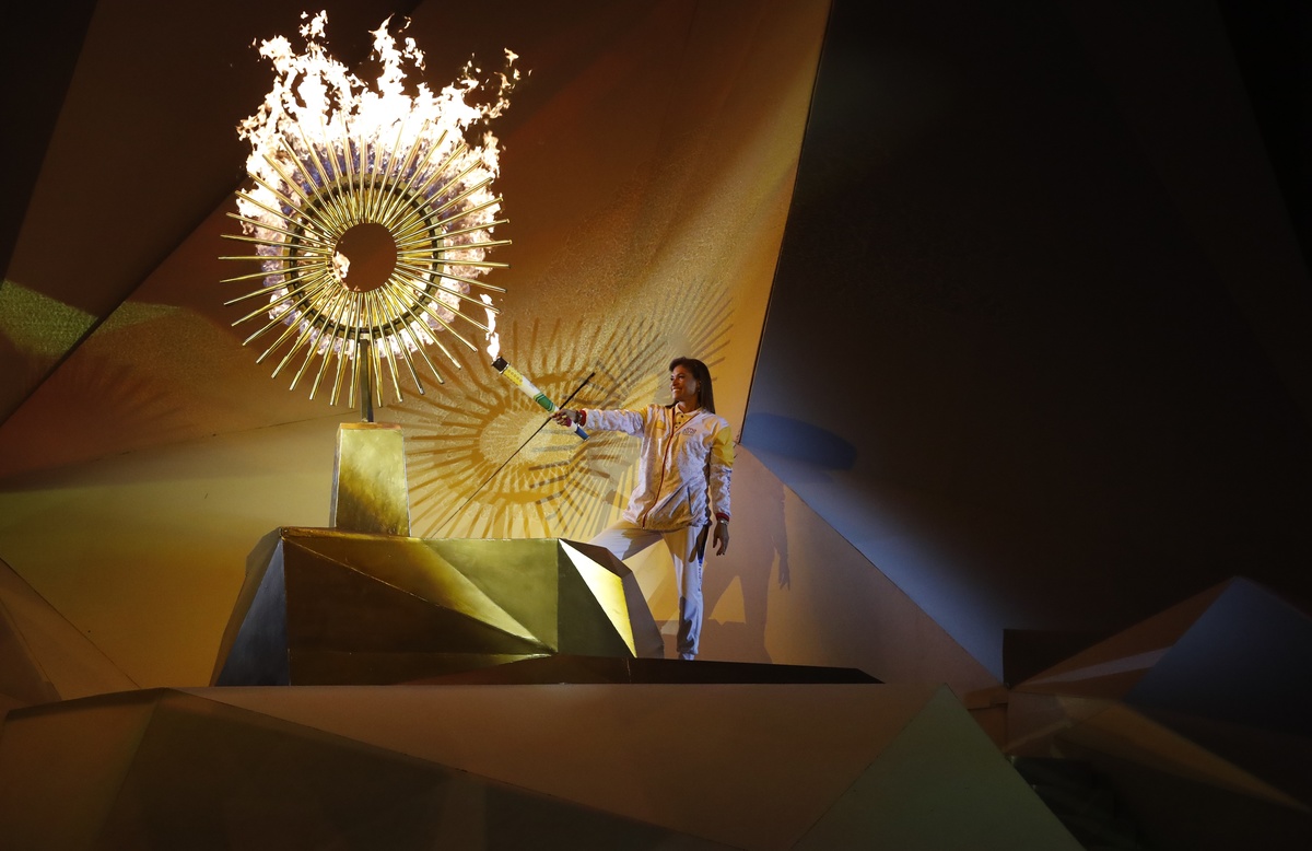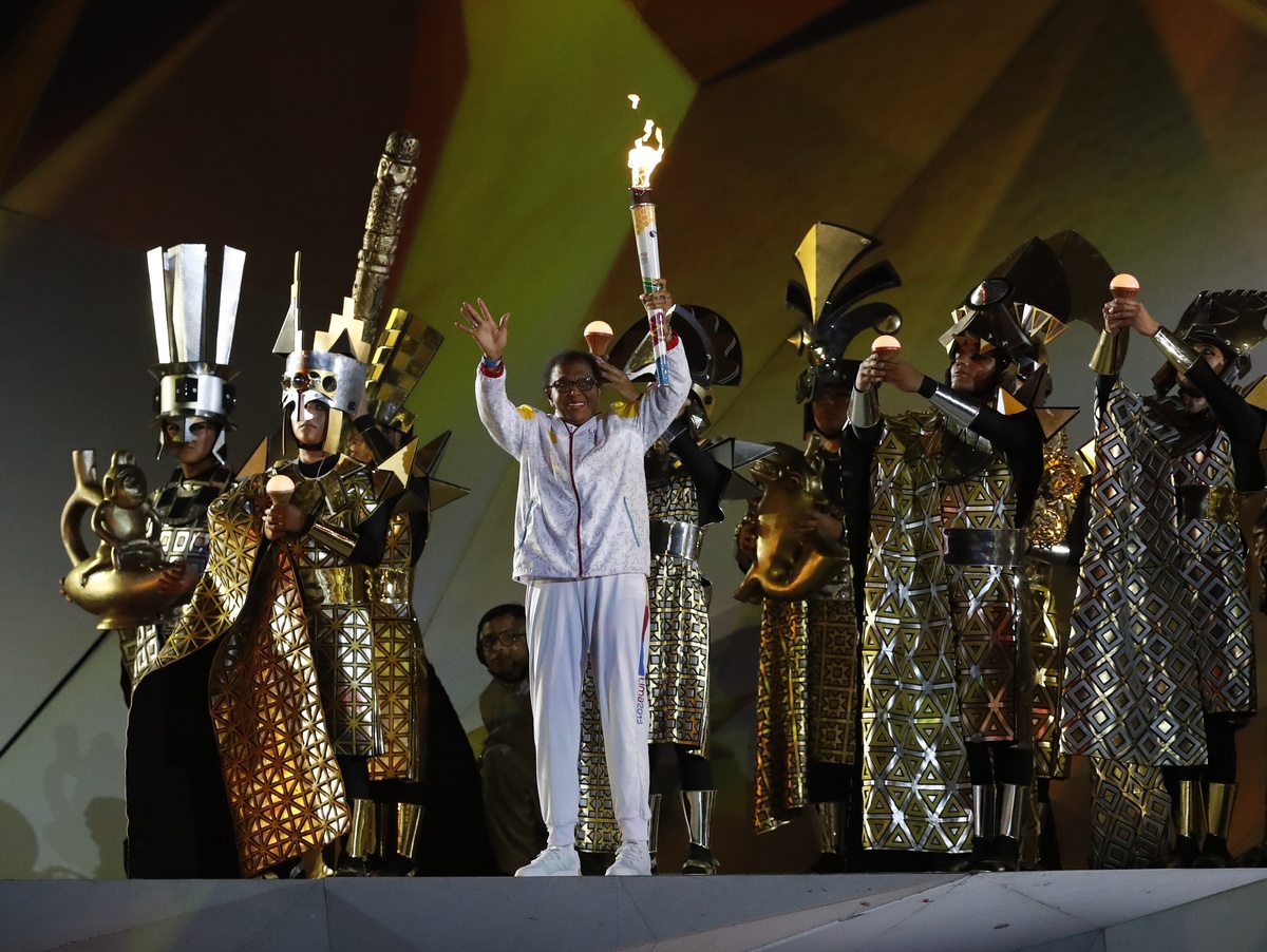 XVIII Pan American Games - Lima 2019 - Opening Ceremony - Estadio Nacional, Lima, Peru - July 26, 2019. Retired Peruvian volleyball player Cecilia Tait lights the Pan Am Games flame during the opening ceremony. REUTERS/Henry Romero