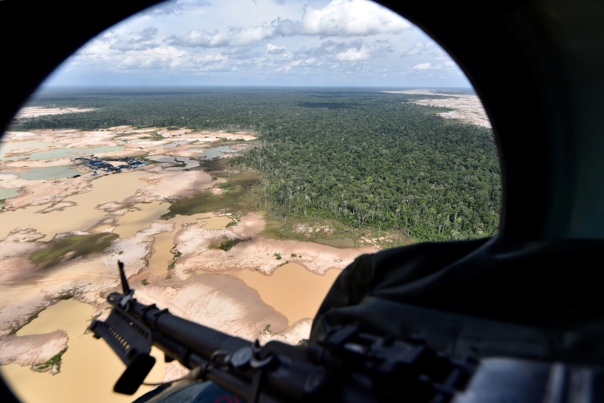 A helicopter gunner sits in his position while flying over illegal mining territories during a police operation to destroy illegal machinery and equipment used by wildcat miners in Madre de Dios, Peru, February 19, 2019. Picture taken February 19, 2019 Cristobal Bouroncle/Pool via REUTERS
