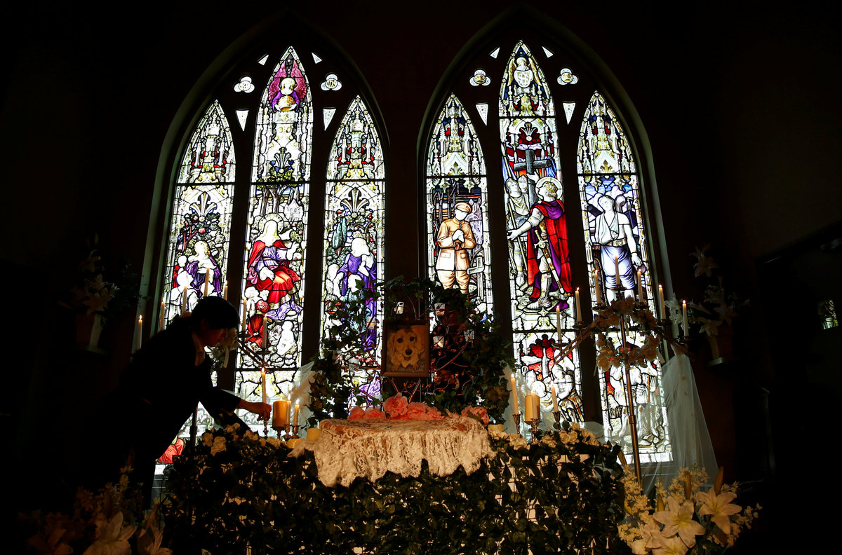A staff prays in front of an altar for a pet dog during a demonstration of pet funeral services at the Pet Rainbow Festa, a pet funeral expo targeting an aging pet population, in Tokyo, Japan September 18, 2017. REUTERS/Kim Kyung-Hoon