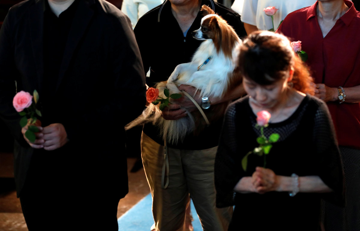 A family carrying their pet dogs places flowers on an altar for a pet dog during a demonstration of pet funeral services at the Pet Rainbow Festa, a pet funeral expo targeting an aging pet population, in Tokyo, Japan September 18, 2017. REUTERS/Kim Kyung-Hoon