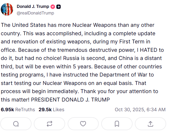 Hegseth’s visit came after President Donald Trump announced on Truth Social that he had asked the U.S. military to “start testing our Nuclear Weapons,” after a halt for 33 years.