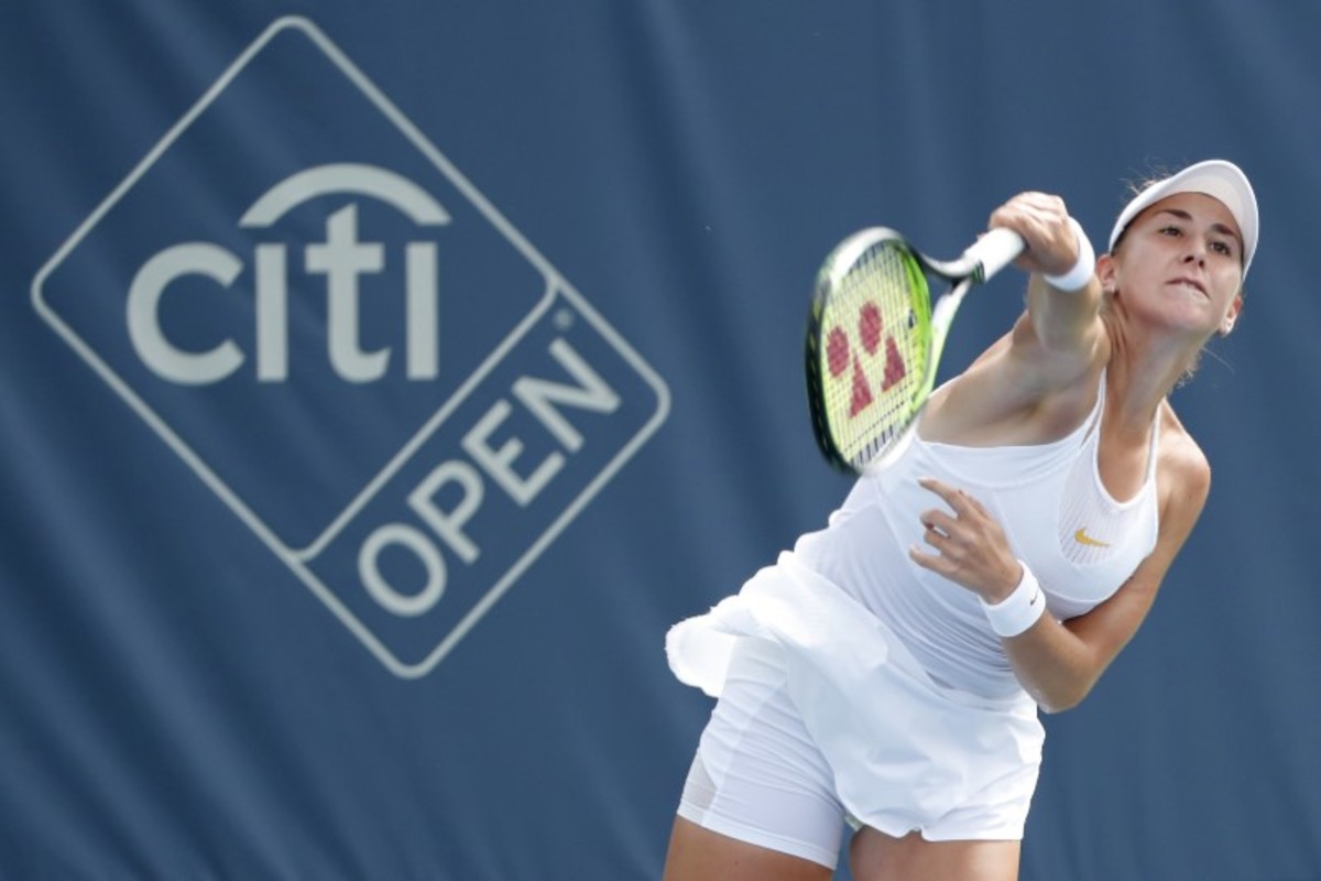 Aug 3, 2018; Washington, DC, USA; Belinda Bencic of Switzerland hits a forehand against Andrea Petkovic of Germany (not pictured) in a women's singles quarterfinal of the 2018 Citi Open at Rock Creek Park Tennis Center. Mandatory Credit: Geoff Burke-USA TODAY SportsAug 3, 2018; Washington, DC, USA; Belinda Bencic of Switzerland serves against Andrea Petkovic of Germany (not pictured) in a women's singles quarterfinal of the 2018 Citi Open at Rock Creek Park Tennis Center. Mandatory Credit: Geoff Burke-USA TODAY Sports