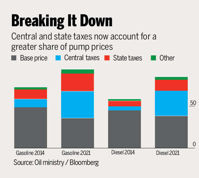 Fuel prices in India are at records even though Brent is well below its peak. The government kept upping taxes last year even as it put the country into a national lockdown and global crude prices collapsed.