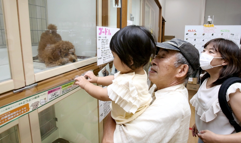 On Sept. 15, a family was gazing at a Shiba Inu puppy frolicking in its cage and a toy poodle sleeping peacefully at Pet Kazoku's Inagioshidate Store in Tokyo.