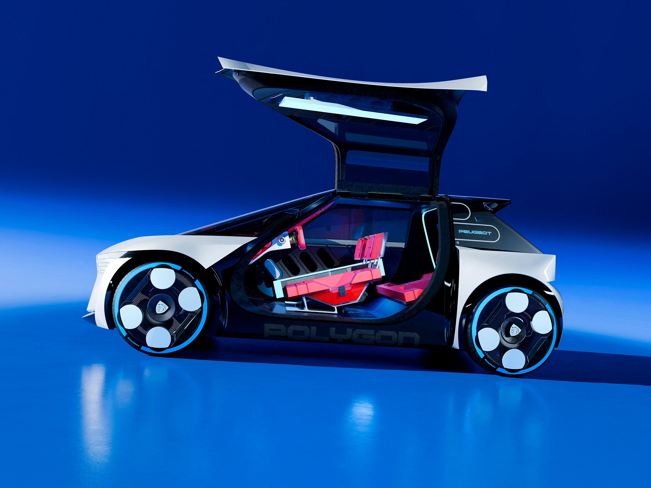 As with rival small cars like the Mini, Peugeot is also pushing personalisation. Components including the Hypersquare controller, parts of the dashboard, seats and wheel covers can be swapped quickly, allowing the car to evolve over time. Goodyear has developed laser-engraved tyres with coloured sidewalls to complement the concept’s configurable aesthetic, supported by the brand’s SightLine intelligent tyre technology for real-time road and tyre condition insights.