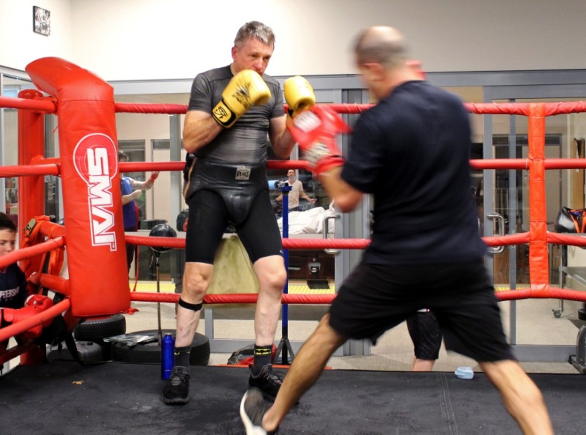 Back in the boxing ring, Smith uses his lead right-hand to parry his opponent's jab, deflecting it with an open glove like someone cooking a barbeque wards off an incoming insect, before unleashing a flurry of good-natured body shots.