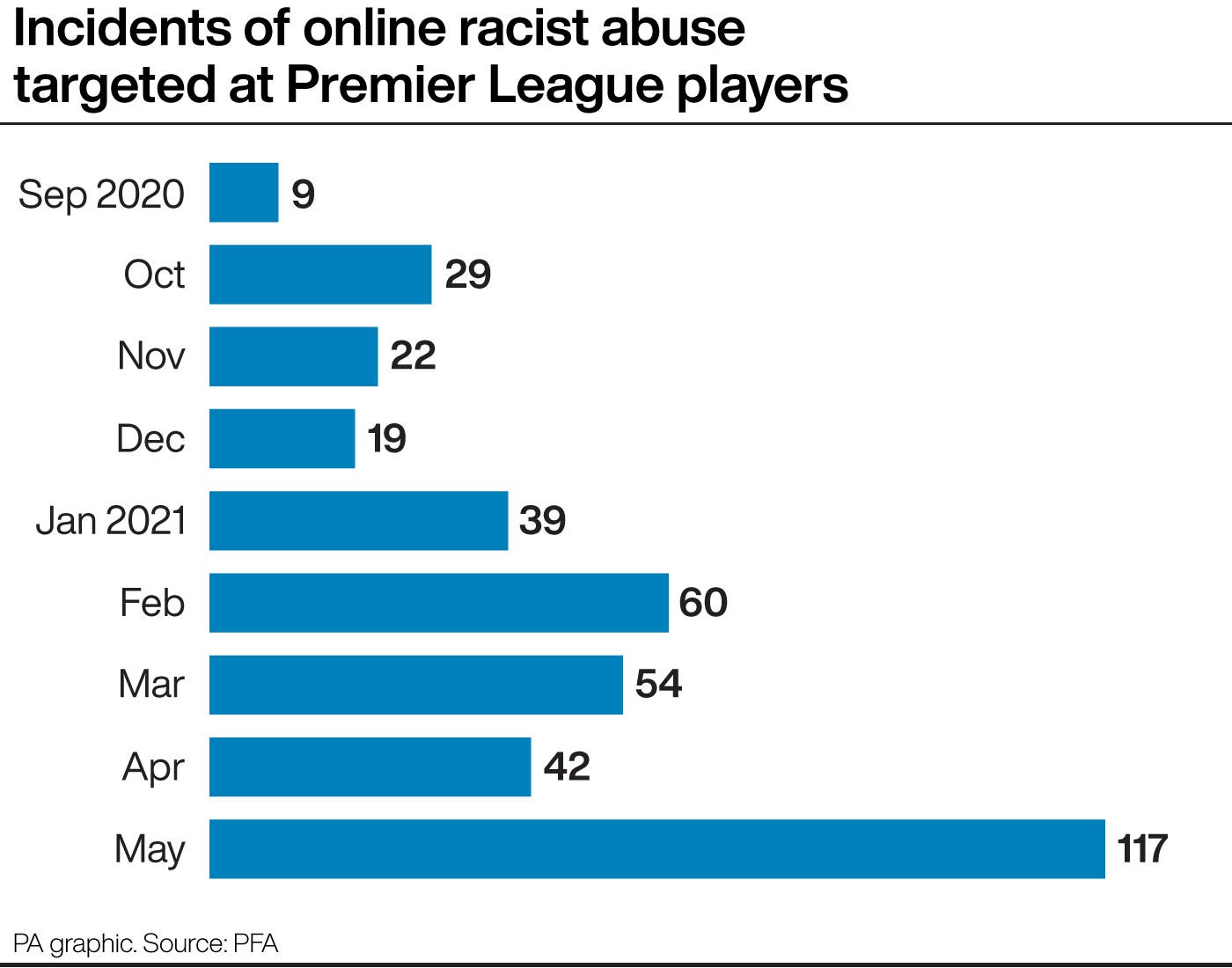 Just over 50 per cent of the abusive messages were traced back to UK-based accounts, the report said, and the problem got worse as the season progressed – with racist abuse increasing by 48 per cent in the second half of the campaign compared to the first.