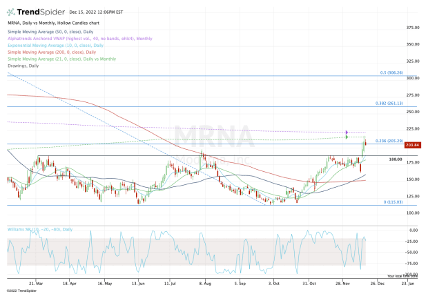 If Moderna stock can take out this week’s high of $217.25, then we could see a move to $225. If the bulls really take control, $250 to $260 could be on the table.
