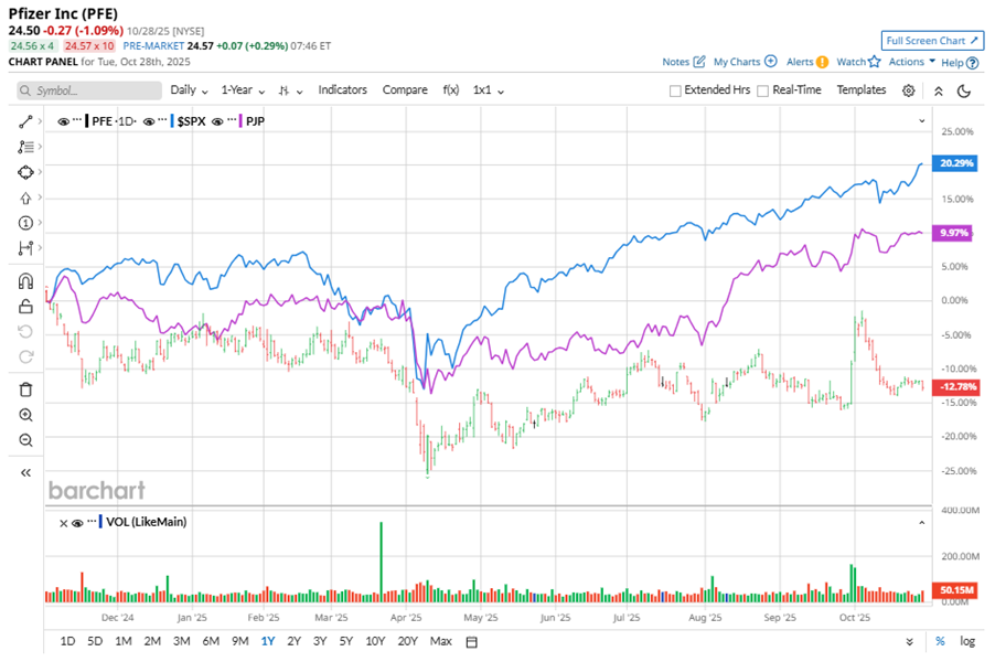 Shares of this pharmaceutical giant have underperformed the broader market over the past year. PFE has declined 15.1% over this time frame, while the broader S&P 500 Index ($SPX) has rallied nearly 18.3%. In 2025, PFE stock is down 7.7%, compared to SPX’s 17.2% rise on a YTD basis.