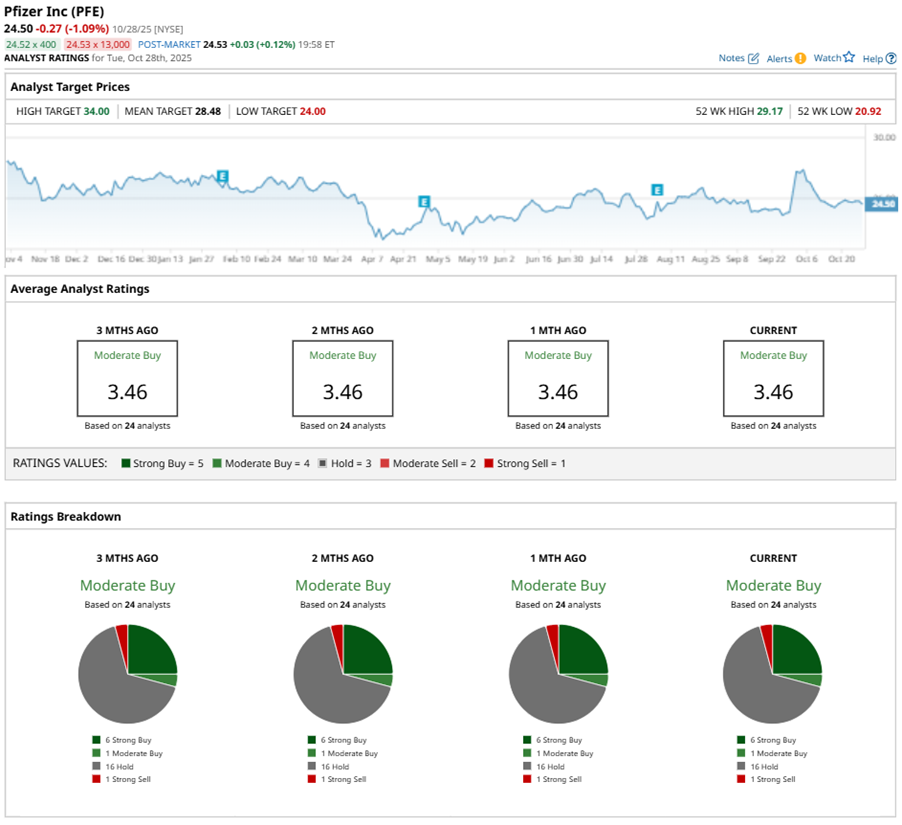 On Oct. 27, Berenberg Bank analyst Luisa Hector maintained a “Hold” rating on PFE and set a price target of $25, implying a potential upside of 2% from current levels.