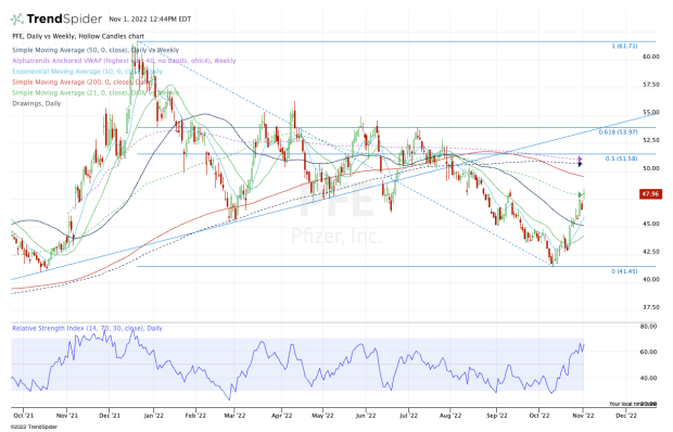 If Pfizer stock can clear the 21-week moving average, it opens the door to $50 and the 200-day moving average.