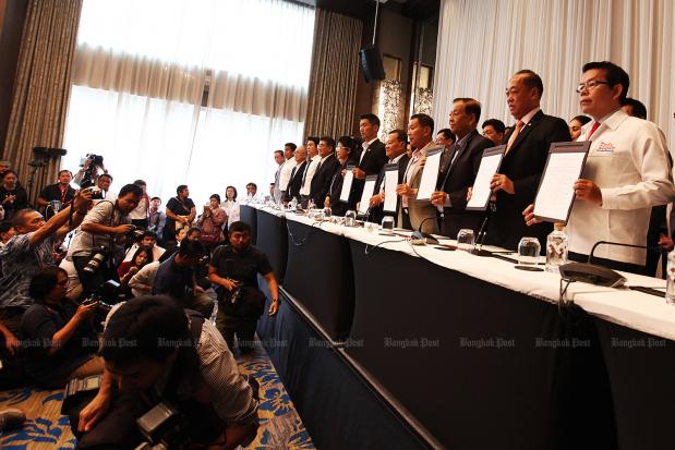 Shortly after initial results of the March 24 were made available, the bloc held a press conference to announce it had secured 255 seats, which is comprised of 137 MPs from Pheu Thai, 88 from the FFP, 12 from Seri Ruam Thai, seven from the New Economics Party, seven from Prachachat, five from Puea Chat and one from the Thai People Power Party.