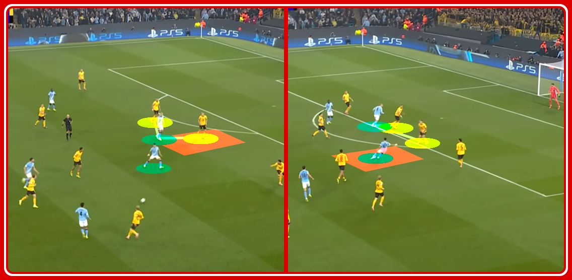 As the move develops, he’s standing in the exact spot from which Foden will eventually shoot. But as soon as he receives the ball, he drives towards goal, pulling defenders away and creating the space that makes the chance possible.