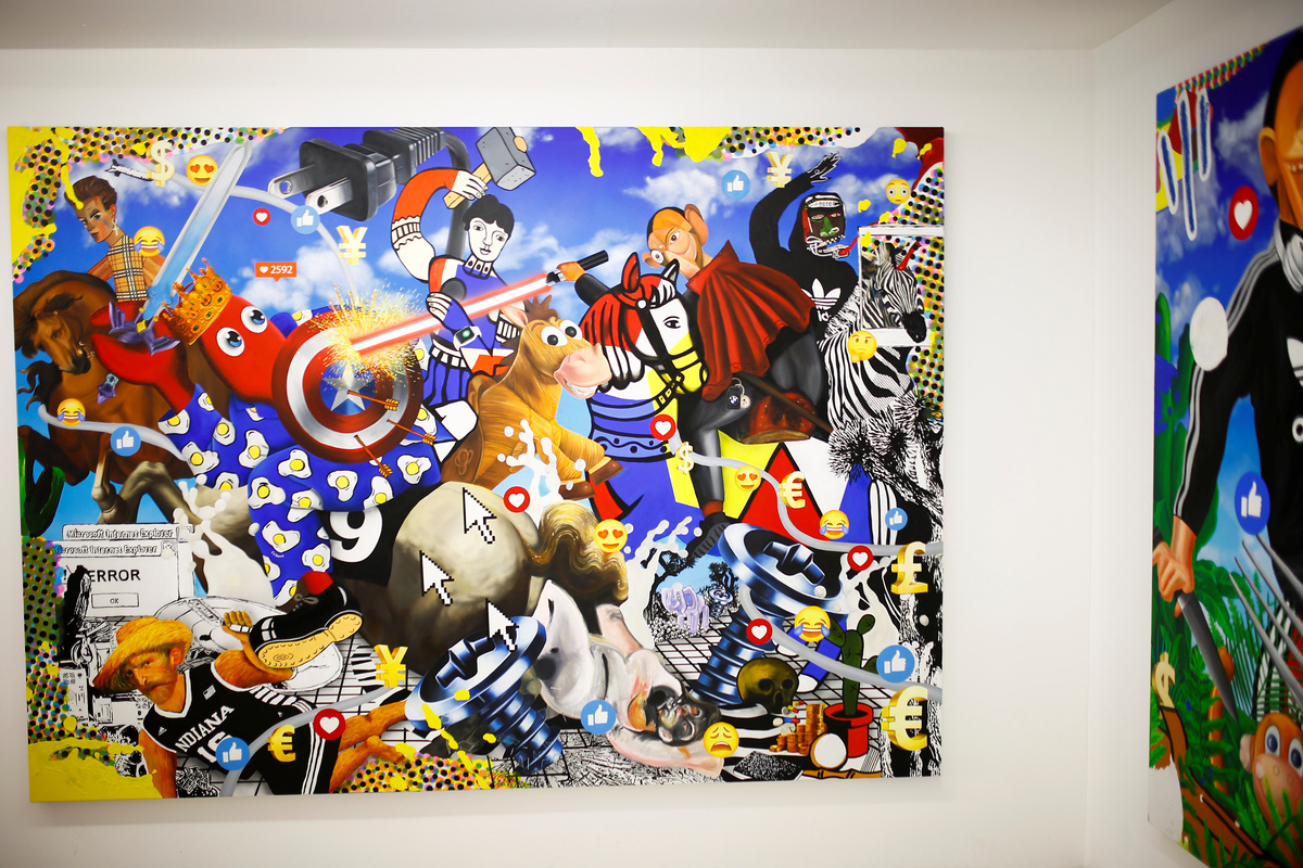 Scottish born Colbert, who has worked across music, fashion and design, says his large-scale oil paintings interweave art history references with Internet and social media images, such as emojis and like buttons, in bright cartoon-like collages featuring his lobster alter-ego.