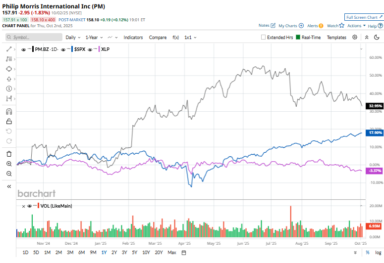 Shares of Philip Morris have jumped 32% over the past 52 weeks, outperforming both the S&P 500 Index's ($SPX) 17.6% rise and the Consumer Staples Select Sector SPDR Fund’s (XLP) 5% decline over the same period.