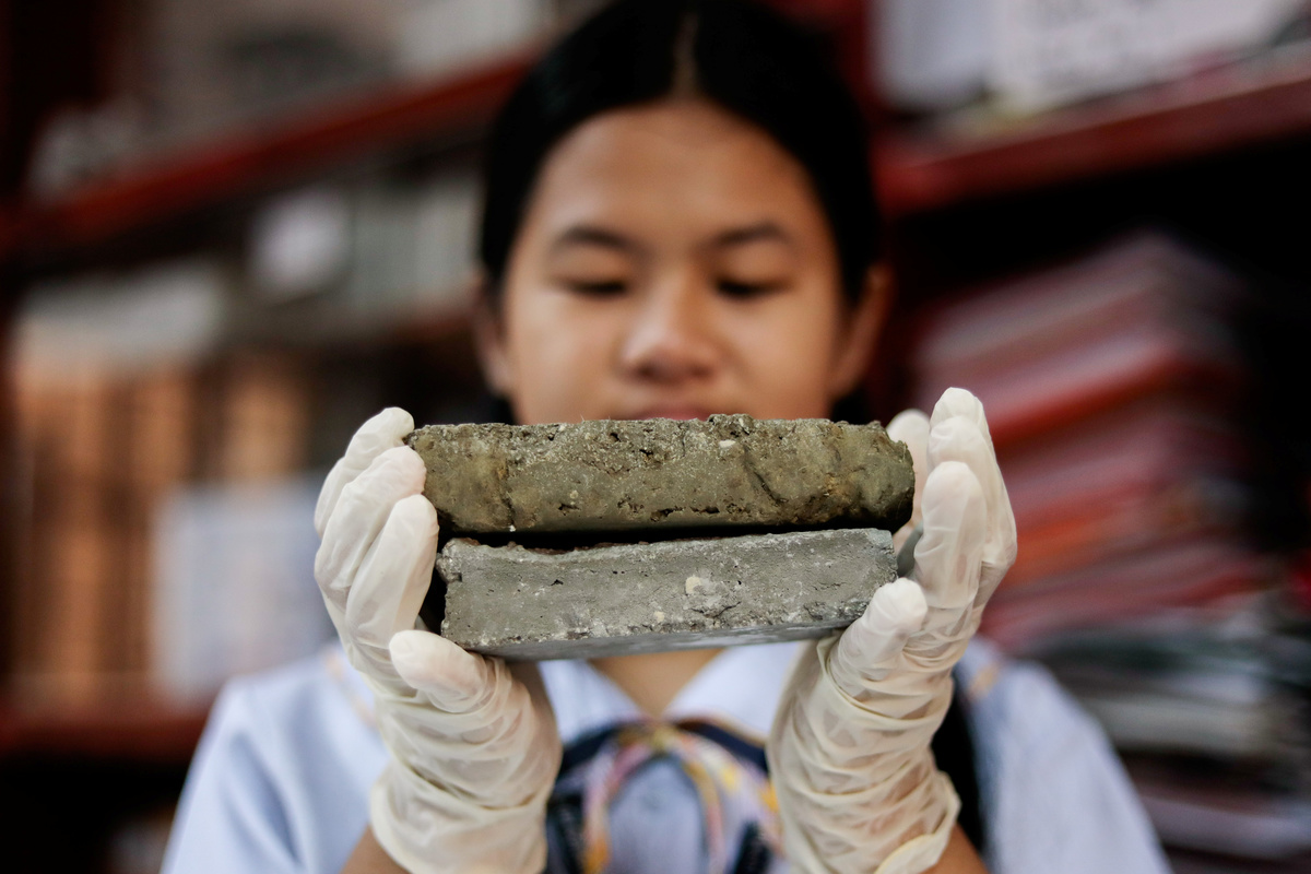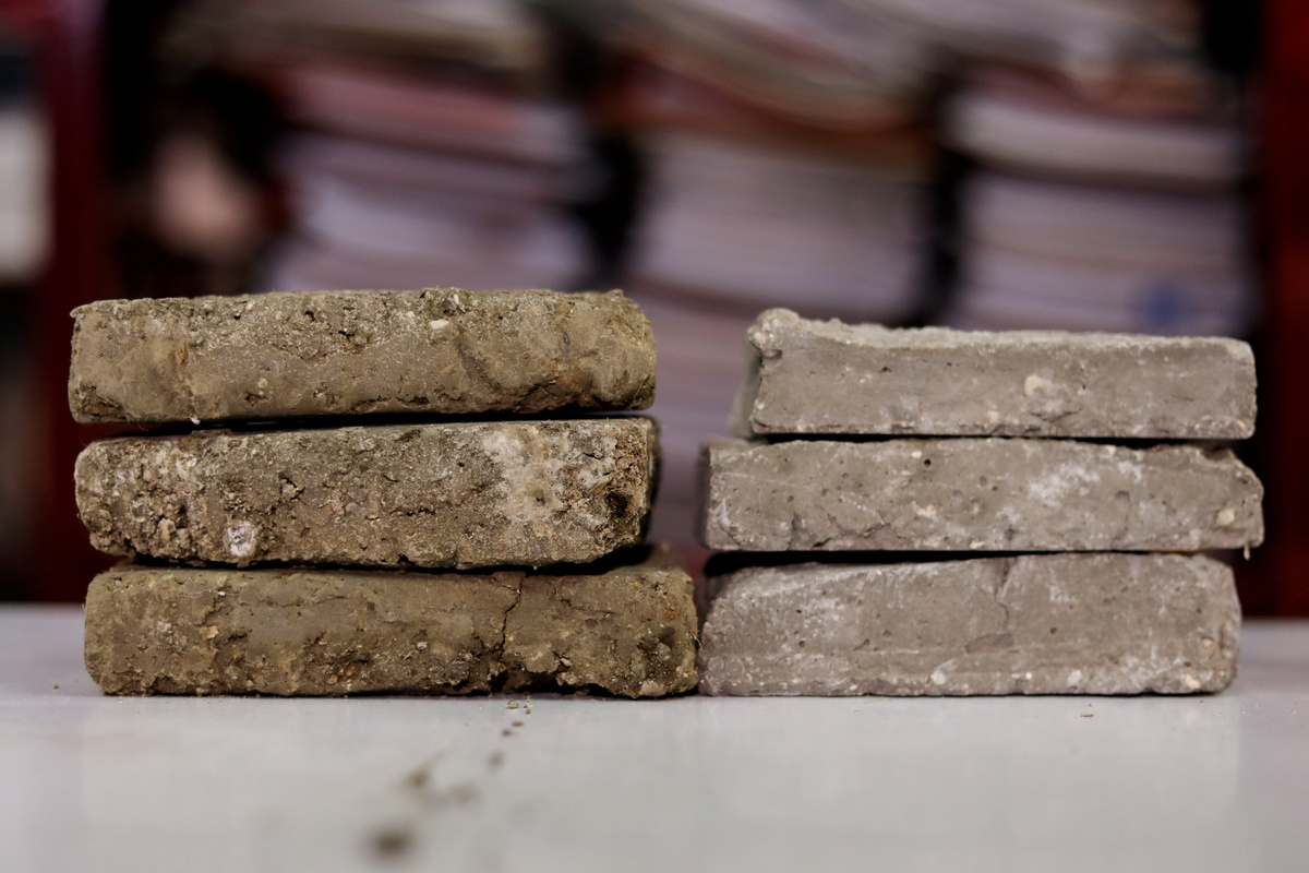 As part of a research project, eighth graders in the Payatas district north of the capital Manila gathered and air-dried dog faeces, which were then mixed with cement powder and moulded into rectangular "bio bricks".