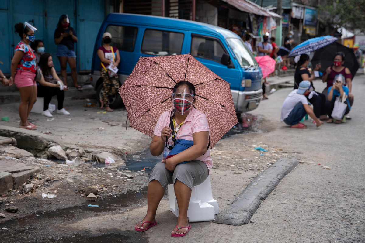 A woman sits on a piece of styrofoam while queueing for cash subsidy from the government amid the coronavirus disease (COVID-19) outbreak, in Batasan Hills, Quezon City, Metro Manila, Philippines, August 27, 2020. REUTERS/Eloisa Lopez