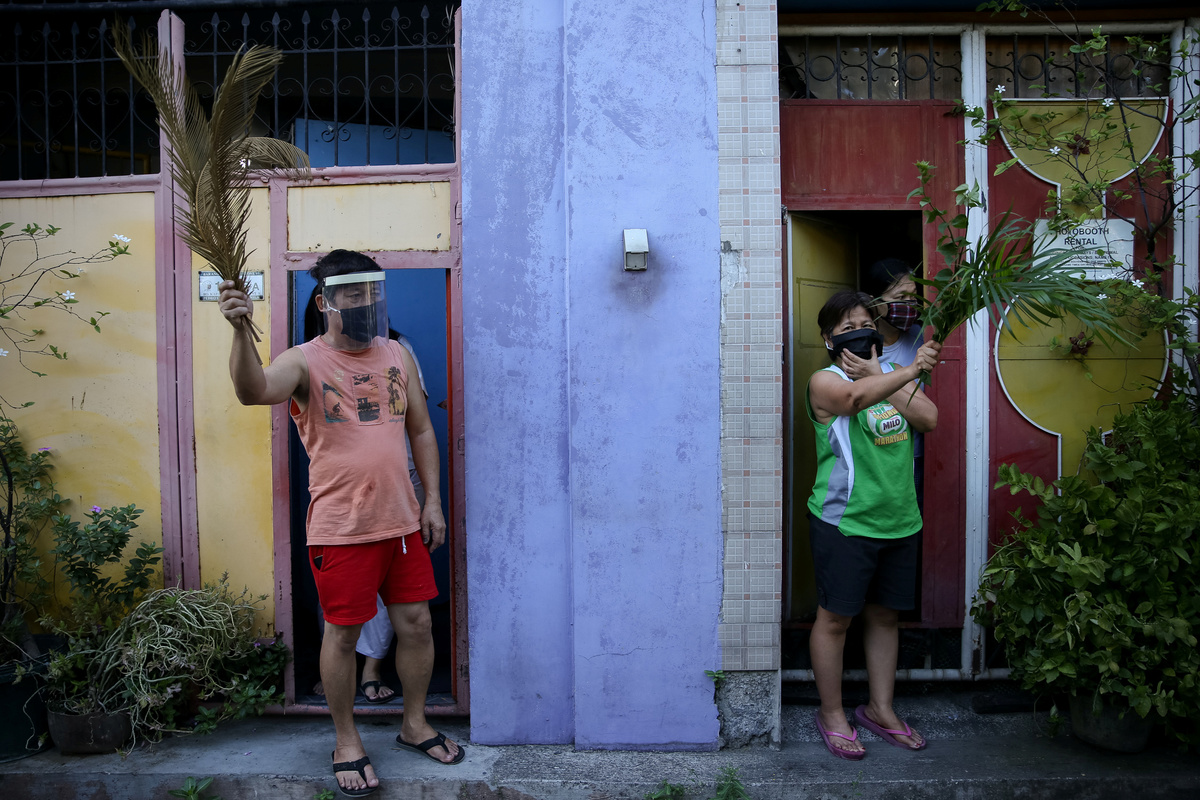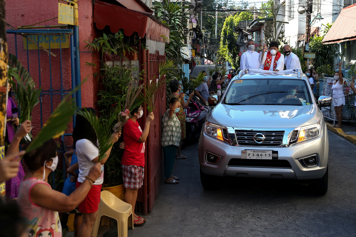 Filipino Catholics wave palm fronds outside their homes to be blessed by a priest roaming neighbourhoods to celebrate Palm Sunday amid the lockdown to contain the coronavirus disease (COVID-19), in Manila, Philippines, April 5, 2020. REUTERS/Eloisa Lopez