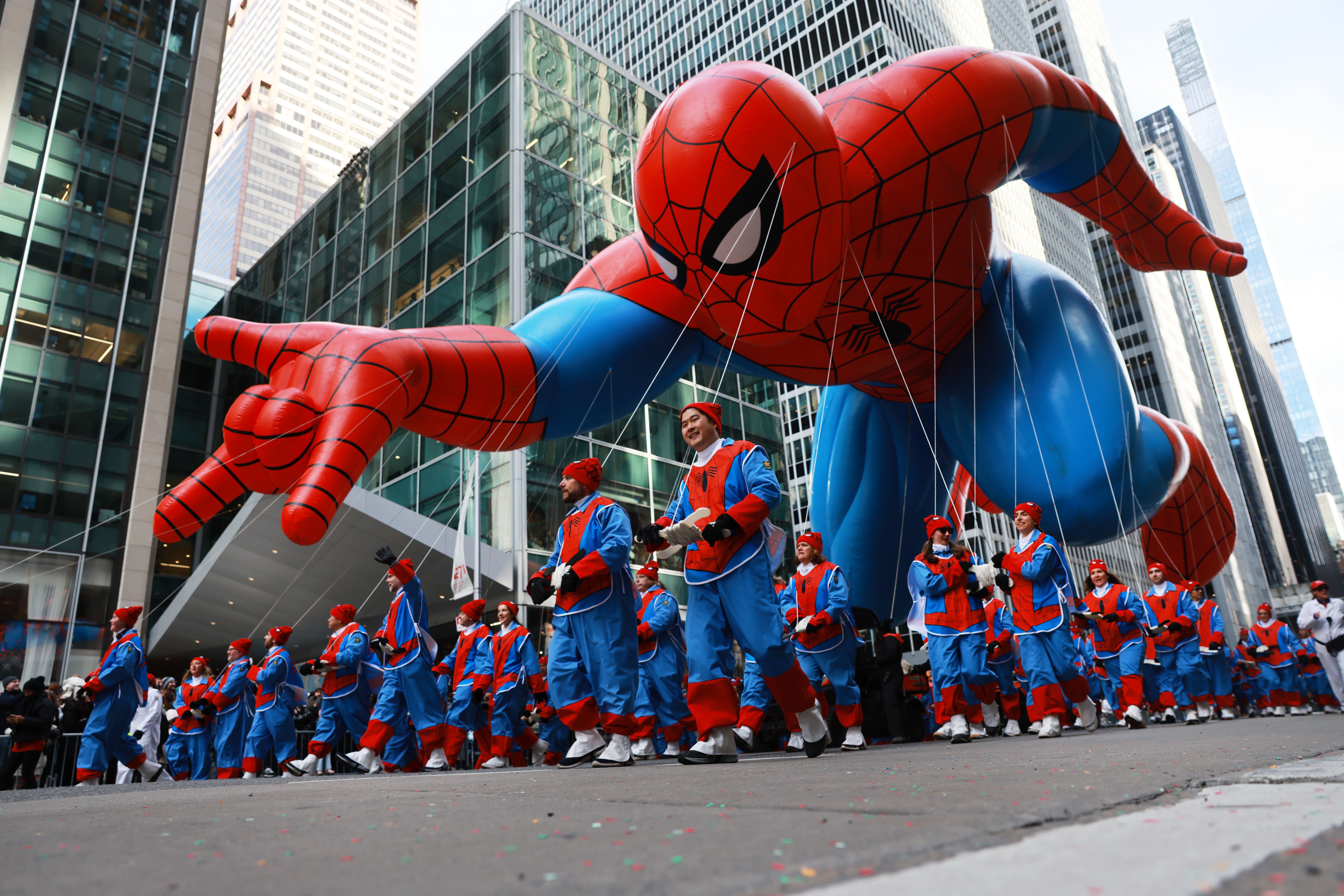 People operate the Spider-Man balloon during the parade. Photo: Spencer Platt/Getty Images