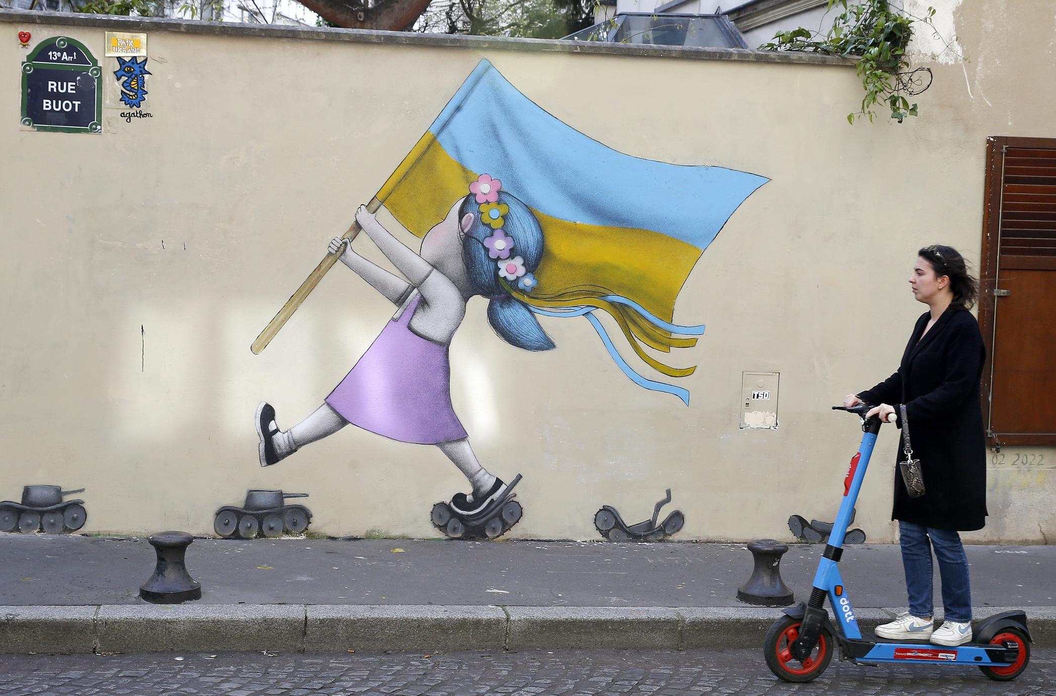 In Paris’ working-class 13th arrondissement, a young girl wearing a lilac-colored dress and traditional vinok, a crown of flowers and ribbons, proudly waves the Ukrainian flag as she crushes Russian tanks under her Mary Janes. She is the creation of the street artist known as Seth, whose fresco appeared on rue Buot just three days after Russia invaded Ukraine. Prints of the work, entitled “Onwards Ukraine,” have sold out at $55 a pop, with all profits donated to two non-profit organizations helping Ukrainians.
