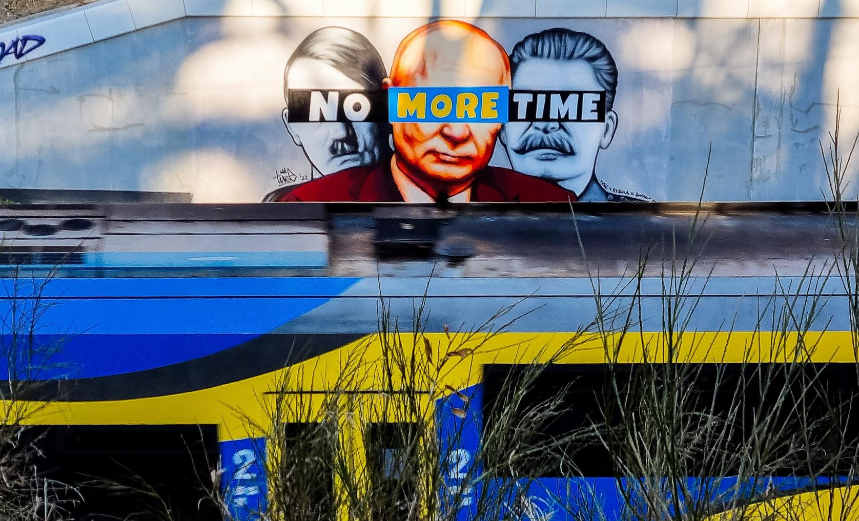 A mural of Putin, Hitler, and Stalin with a slogan “No More Time” has appeared on a wall next to the PKM Gdansk Jasien train station. It is the work of one the most recognizable street artists in Poland, Piotr Tuse Jaworski, better known as Tuse, and the first in a series of anti-war “Solidarity with Ukraine" murals appearing in Gdansk.
