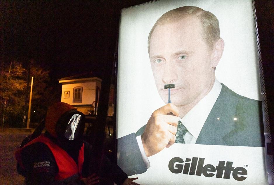 Sometimes called “the Turinese Banksy,” the political satirist and street artist Andrea Villa created a mock Gillette advertisement depicting Vladimir Putin with a Hitler mustache. Andrea Villa is famous for his incisive adbusting posters; this one went viral thanks in part to a retweet from the hacker group Anonymous.