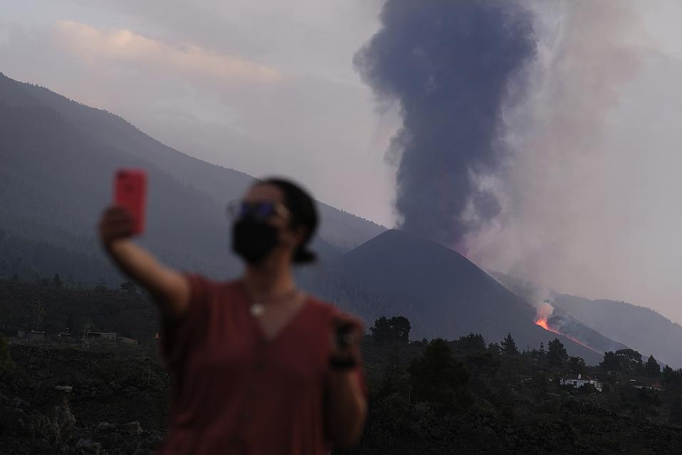 A woman takes a selfie as lava flows from a volcano on the Canary island of La Palma, Spain on Monday.