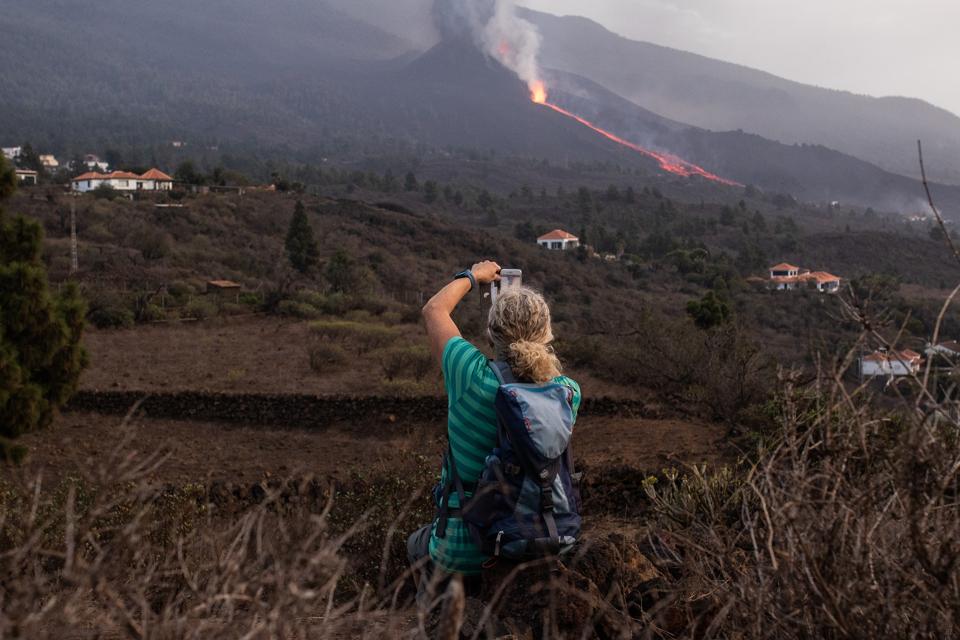 A man takes a photo of the Cumbre Vieja volcano on La Palma as it returns to spewing lava and pyroclasts after hours of relative inactivity.