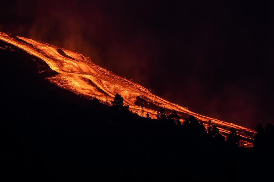 Lava flows from a volcano on the Canary island of La Palma, Spain.