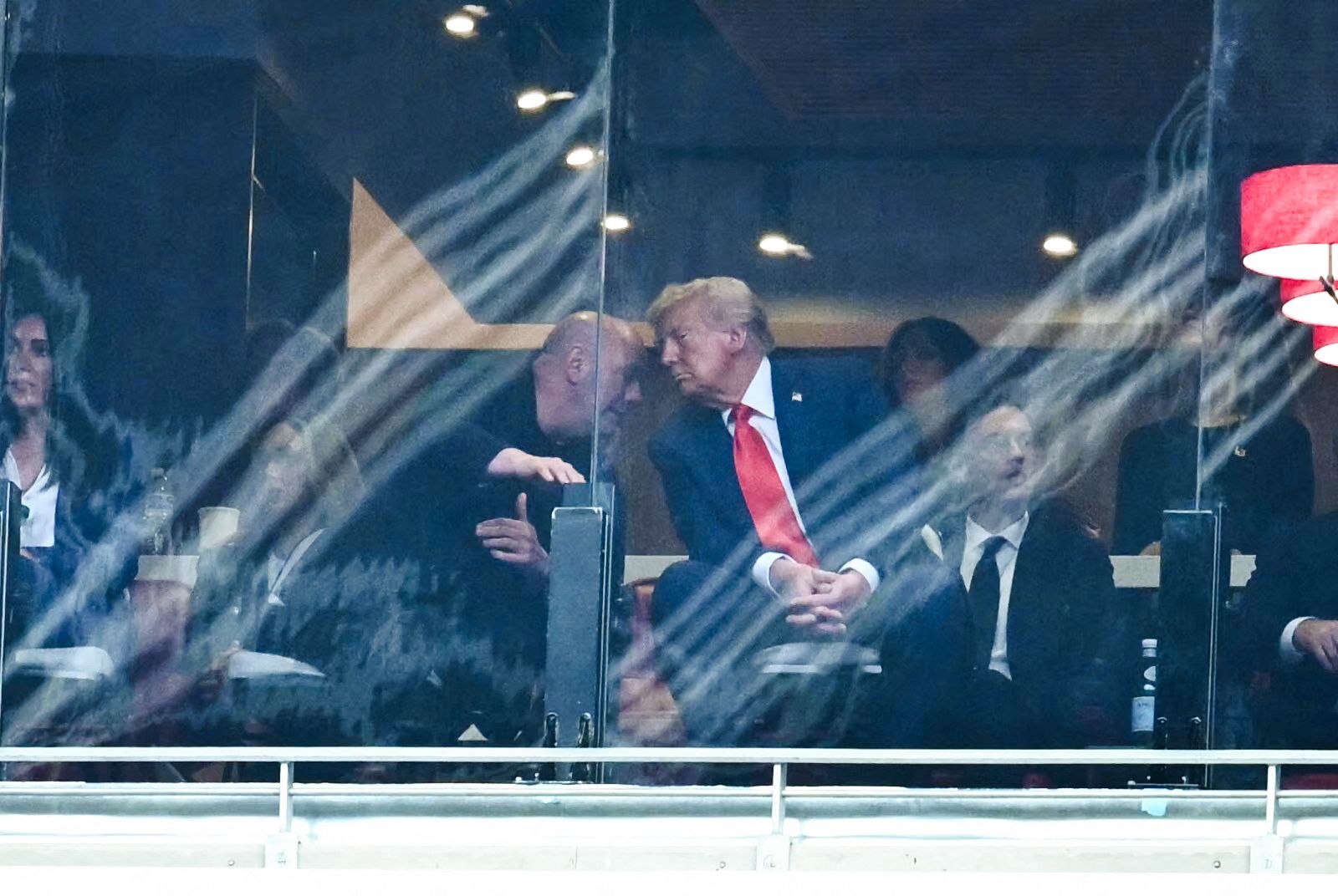 The president speaks with Dana White, CEO and president of the Ultimate Fighting Championship (UFC), at Kirk's memorial service. Photo: Mandel Ngan/AFP via Getty Images