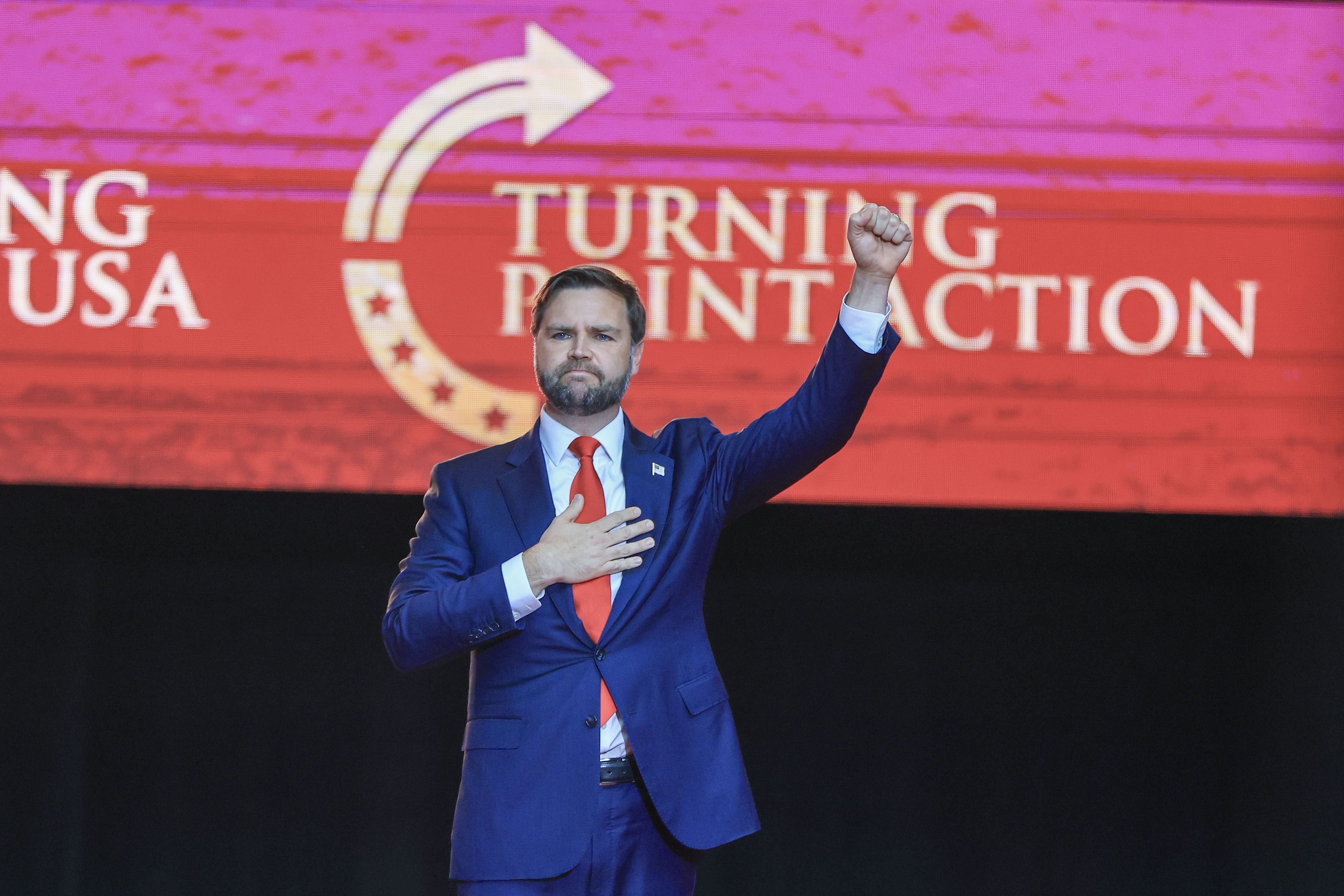 Vice President JD Vance onstage during the memorial service urged those gathered to remember Kirk as "a hero" to the U.S. and as "a martyr for the Christian faith." Photo: Joe Raedle/Getty Images
