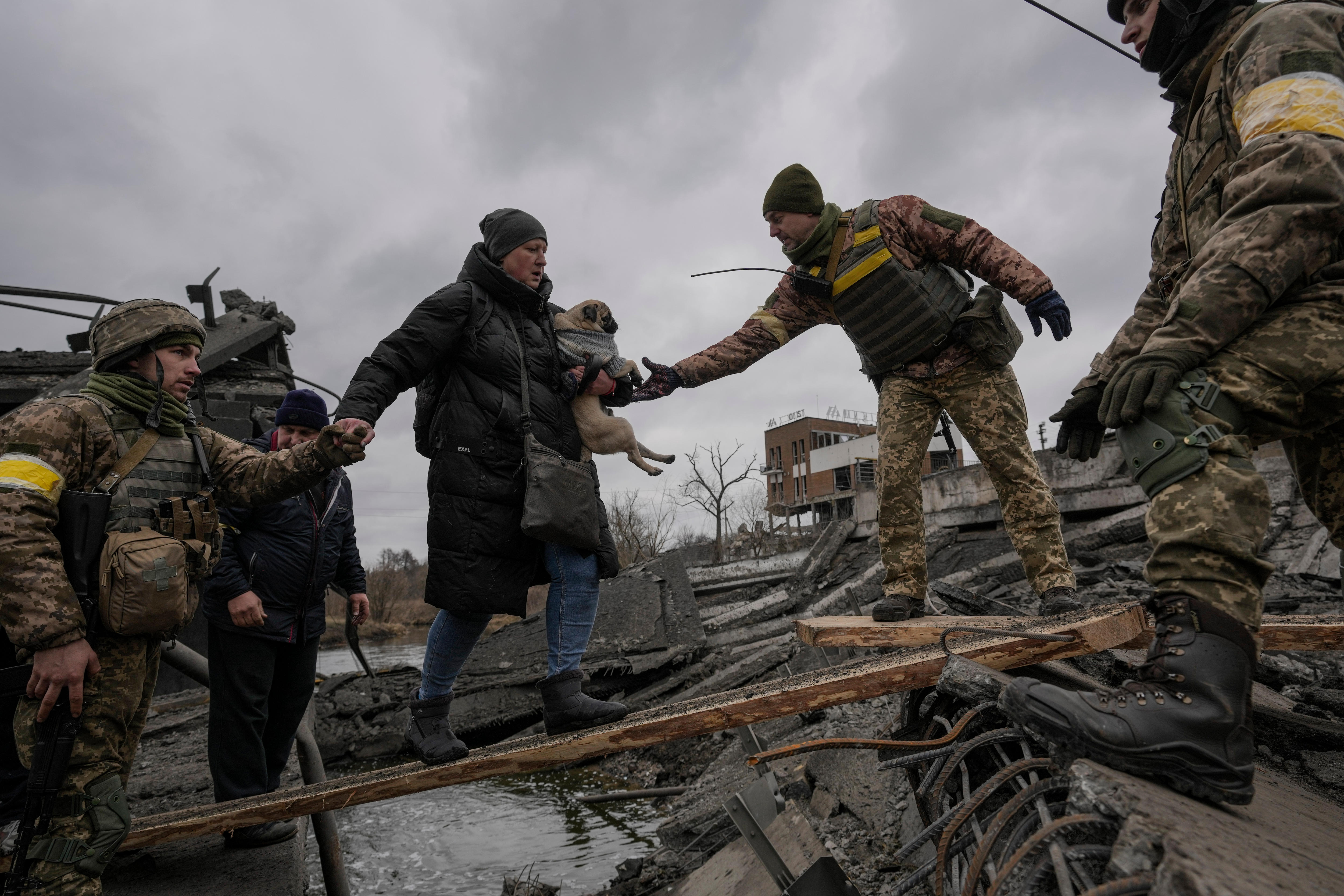 Julia Lazarets plays with her cat Gabriel, after fleeing Ukraine and arriving at the train station in Przemysl, Poland. (AP: Daniel Cole) A puppy in Siret peers his head from a pet carrier after his owner fled the conflict in Ukraine. (AP: Andreea Alexandru) A refugee holding a small dog gives a sip of tea to a toddler after fleeing the conflict into Romania. (AP: Andreea Alexandru) Ukrainian servicemen help a woman carrying a small dog across the Irpin River on an improvised path while assisting people fleeing the town of Irpin, Ukraine. (AP: Vadim Ghirda) Katya holds her two dogs after fleeing from Ukraine, at the border crossing in Medyka, Poland. (AP: Visar Kryeziu) An elderly woman who had collapsed with exhaustion comforts her dog in a ballroom converted into a makeshift refugee shelter, in Suceava, Romania. (AP: Andreea Alexandru) A couple talks after people rushed to board a Lviv-bound train in Kyiv. (AP: Vadim Ghirda)