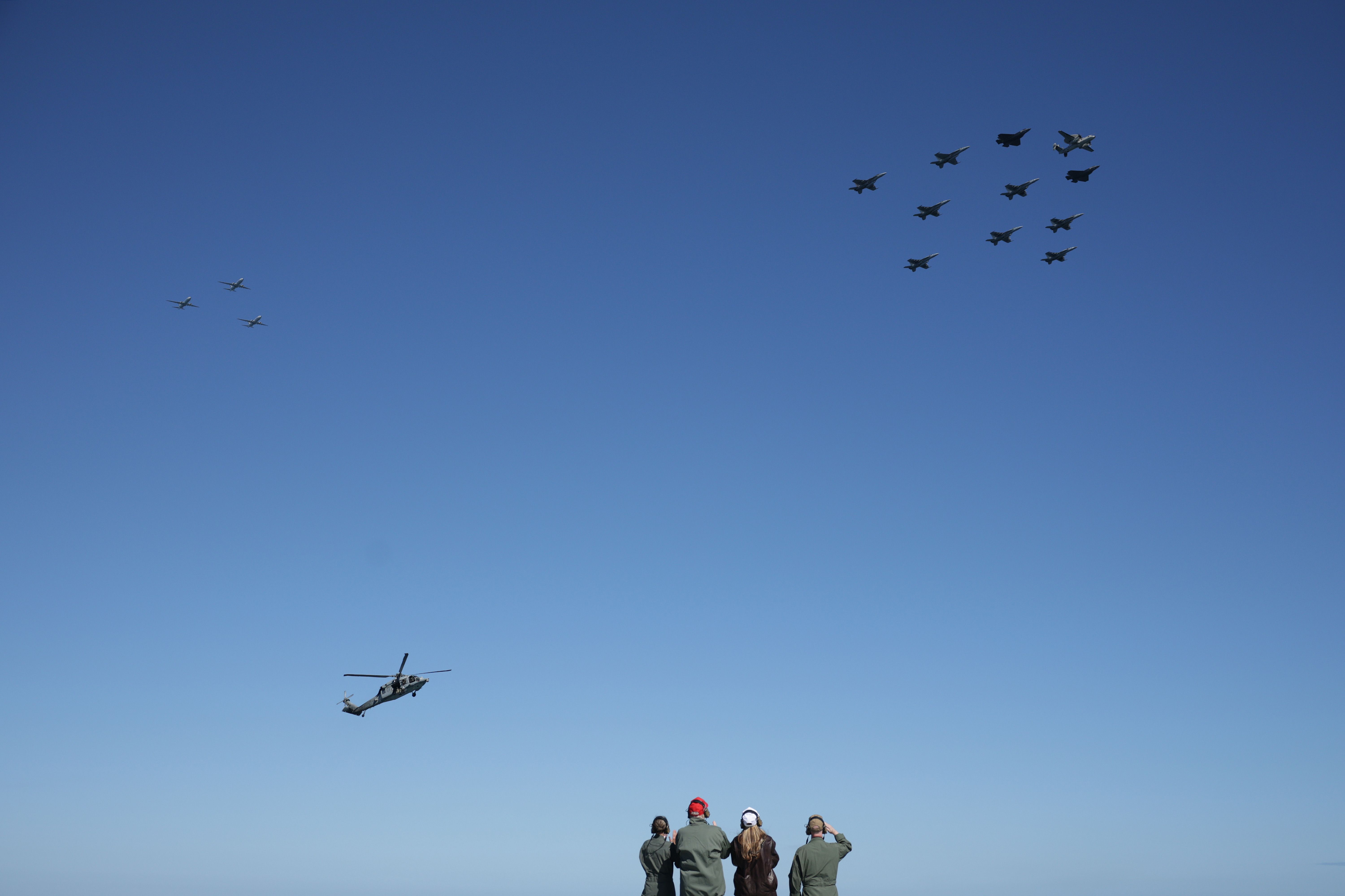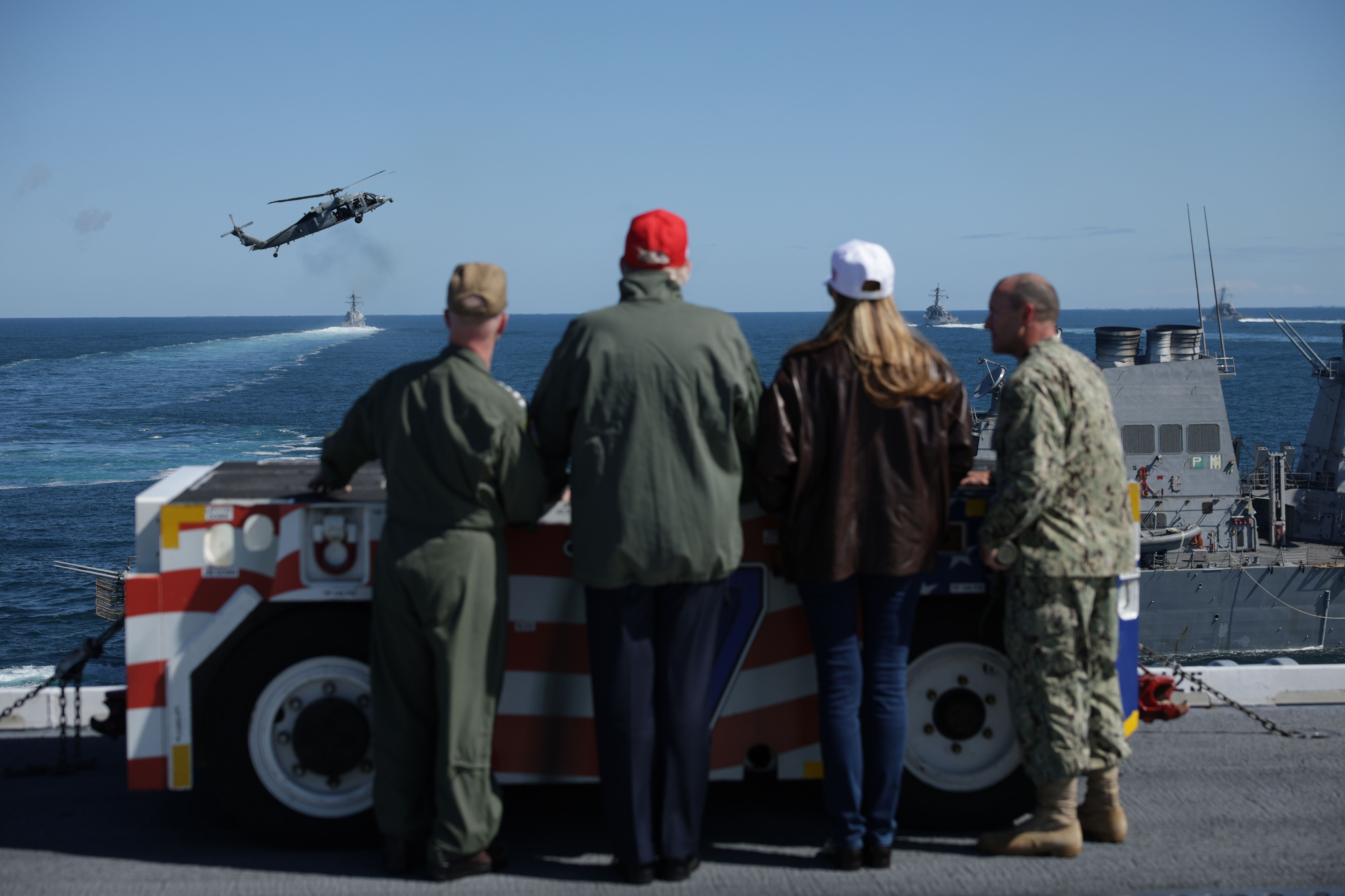 The Trumps observe naval flight demonstrations on the deck of the USS George H.W. Bush aircraft carrier. The first lady greeted some 10,000 sailors with a "hooyah!" when she took the stage at the event. Photo: Alex Wong/Getty Images