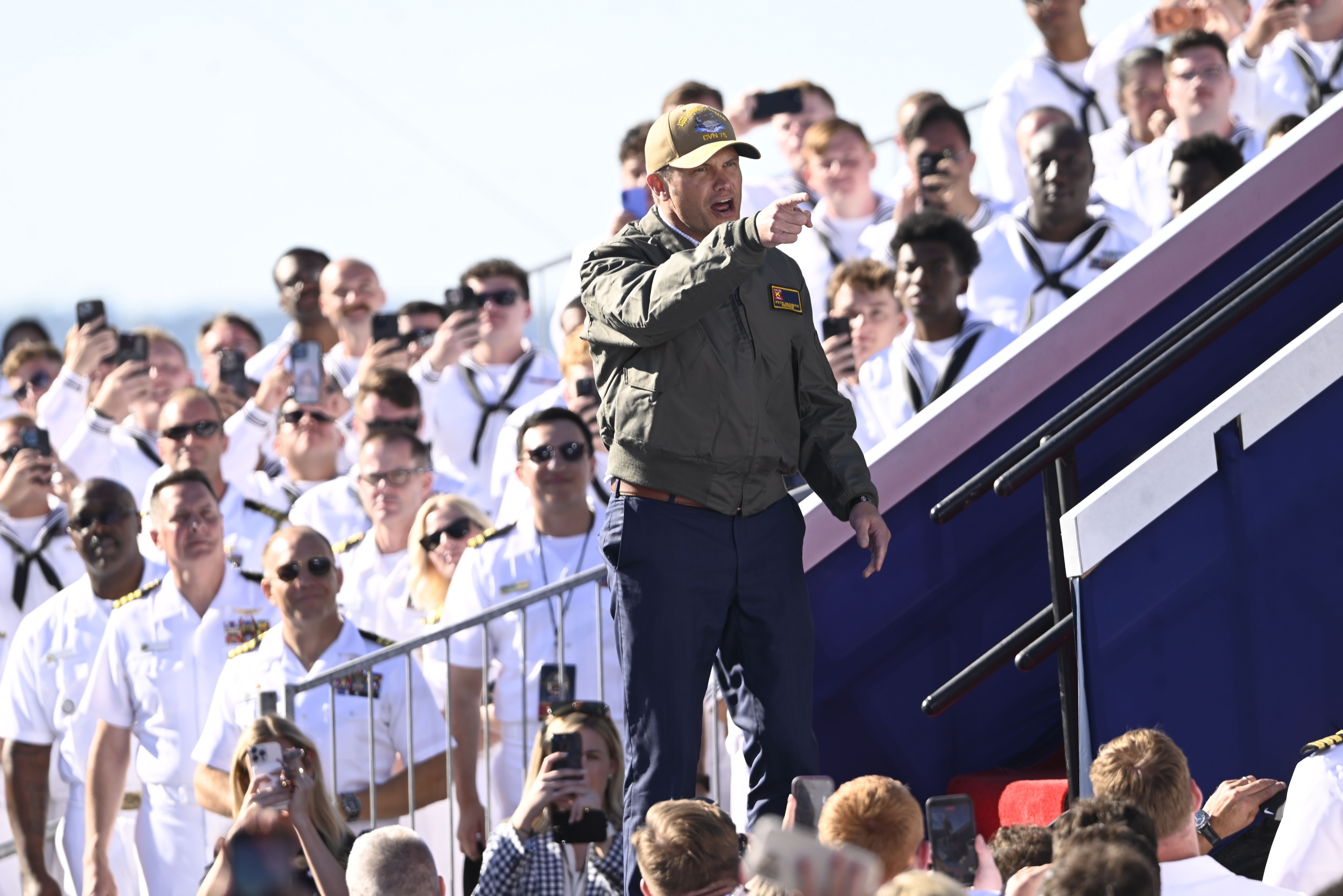 Trump makes remarks during the Navy 250 Celebration aboard the USS Harry S. Truman aircraft carrier, which sometimes felt like a rally. The president said during his speech that ended with a blast of the "YMCA" song that's become his anthem: "Let's face it, this is a rally." Photo: Alex Wong/Getty Images