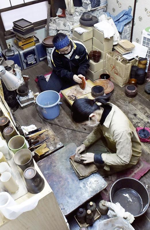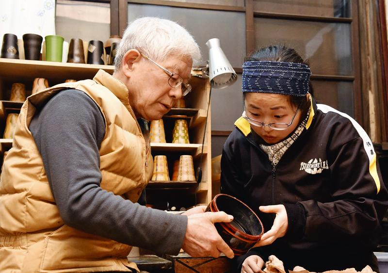The sound of lacquerware being polished reverberates in a roughly 10-square-meter workshop in the Nishiogu district of Arakawa Ward, Tokyo. The workshop belongs to Mitsuo Kaku, a 70-year-old lacquerware craftsman, also known as a "nushi." Working alongside him is Yuka Ito, 26, who since January has spent nearly three hours a day commuting to and from Chigasaki, Kanagawa Prefecture, to learn from Kaku five days a week.
