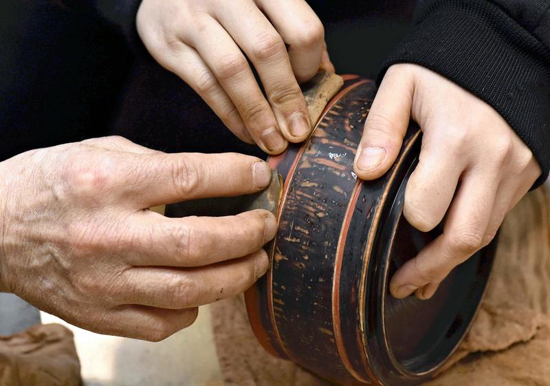 The workshop has another member -- Marie Tsukamoto, 27, who is in her sixth year apprenticing under Kaku. For Ito, she represents a more relatable role model. Holding a lacquered beer mug that Tsukamoto made, Ito said, "Maybe I can also do this someday."