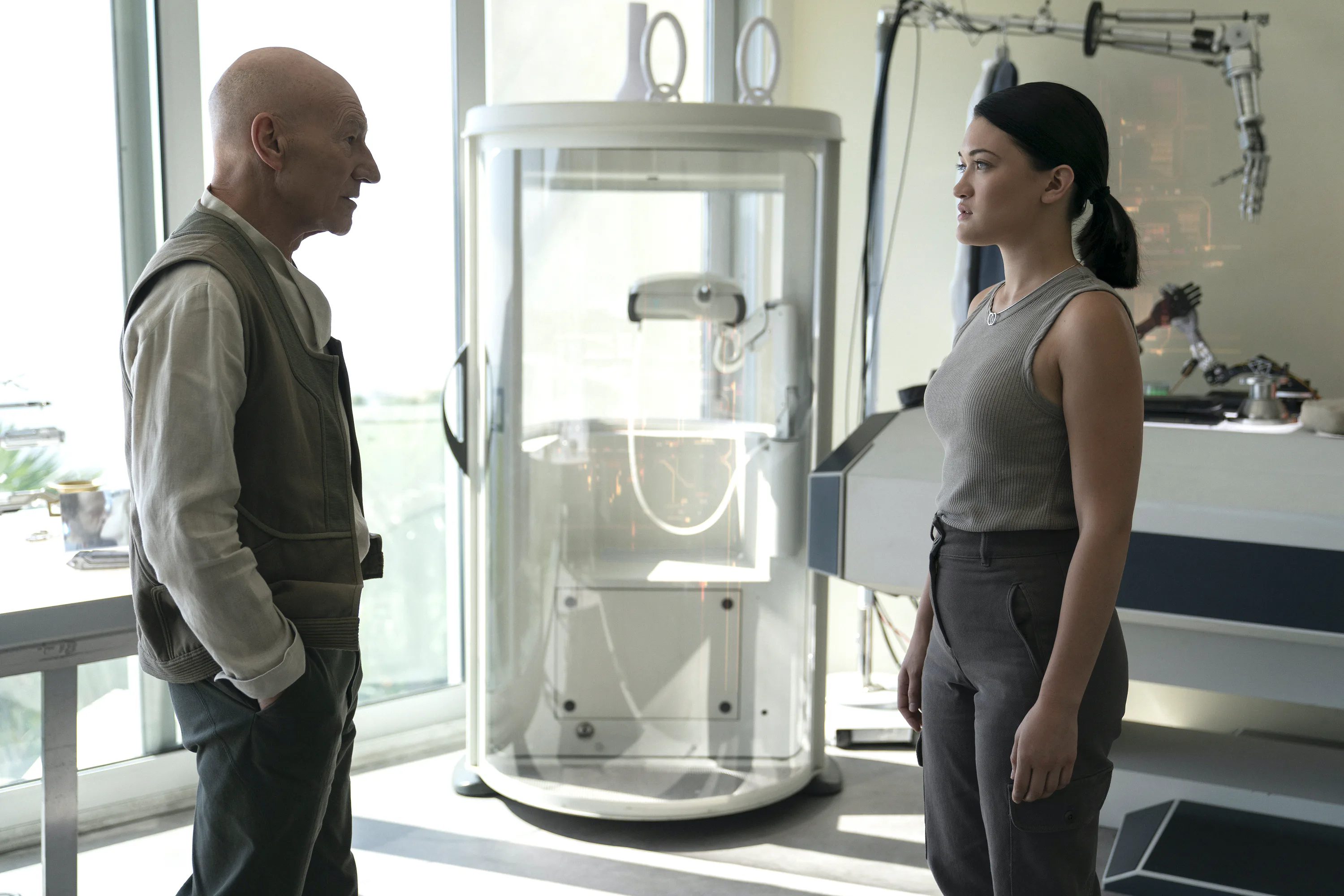 Picard makes no bones about Jean-Luc's new robot bod. We're very clearly told that yes, he's still alive, and yes, he also died. Jean-Luc even jokes with Soji that as a fellow Synth, he's now "free to travel" since the Federation has lifted its android ban. Picard embraces the idea that the notion of being alive or sentient doesn't have to apply to a strict definition of humanity. Blade Runner did this through a noir lens, and Battlestar Galactica did it by telling the story of a space apocalypse. But neither franchise had the guts to make their lead character into a synthetic lifeform.