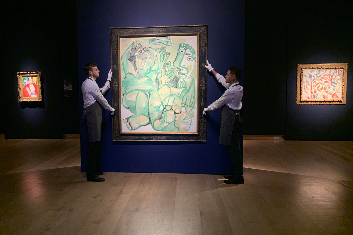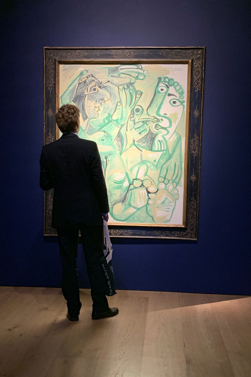 Picasso's green "Homme et femme", painted by the Spanish artist in a day in 1968, is a self-portrait of himself intertwined with his wife Jacqueline, according to Jason Carey, head of impressionist and modern art at Christie's. It is estimated to sell for 10-15 million pounds, he said.