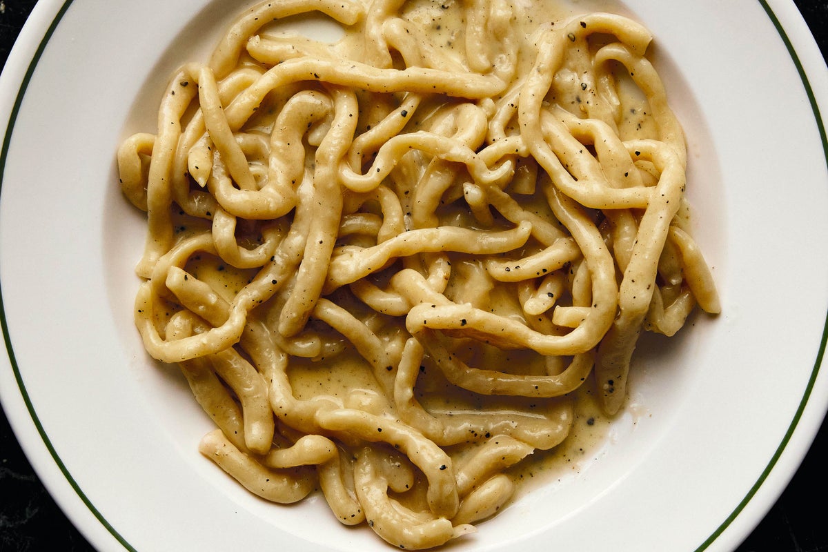 6. Transfer the cooked pici to the buttery pepper sauce, put the pan back over a medium heat and stir until fully coated. Don’t worry if it looks quite soupy at this stage; the sauce will thicken more quickly than you think.