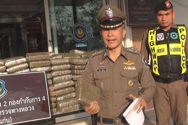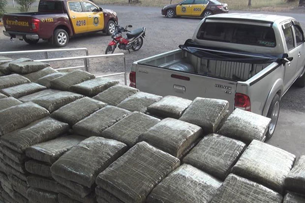 A quick search found four large plastic bags containing 495 bars of compressed marijuana, each weighing 1kg, on the back of the pickup, Pol Col Apichart Phorthichan, chief of highway police sub-division 4, told a media briefing on Friday morning.
