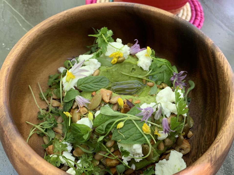 The whipped avocado is both homage to guacamole and reinvention of that wheel (and as simple as it is satisfying): Brokaw avocados whipped up with a variety of seeds and nuts with a little creamy, young goat cheese and some micro-greens and edible flowers.