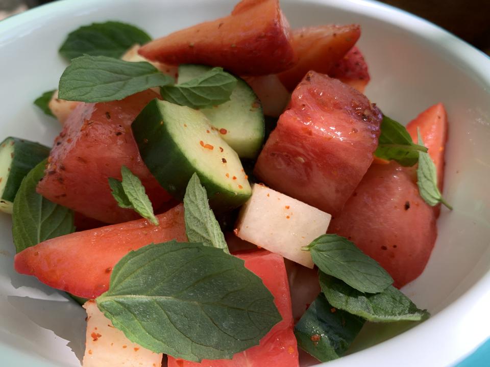 The Cooke Farms organic strawberry salad is a study in contrasts: Crisp, sweetly dry jicama is juxtaposed against the juicy, bright berries, both of which are undercut by sweet watermelon and cucumber, all held together by lime, mint and chile, sort of like a fancy food-truck pico de gallo.