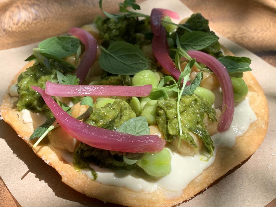 Tostadas and tacos are a centerpiece of the menu. The fresh chickpea tostada with picked red onion knocked my socks off with its clean, earthy flavors, and the calabacitas taco had me at “squash blossom,” presented with tomatillo and sunflower sprouts.