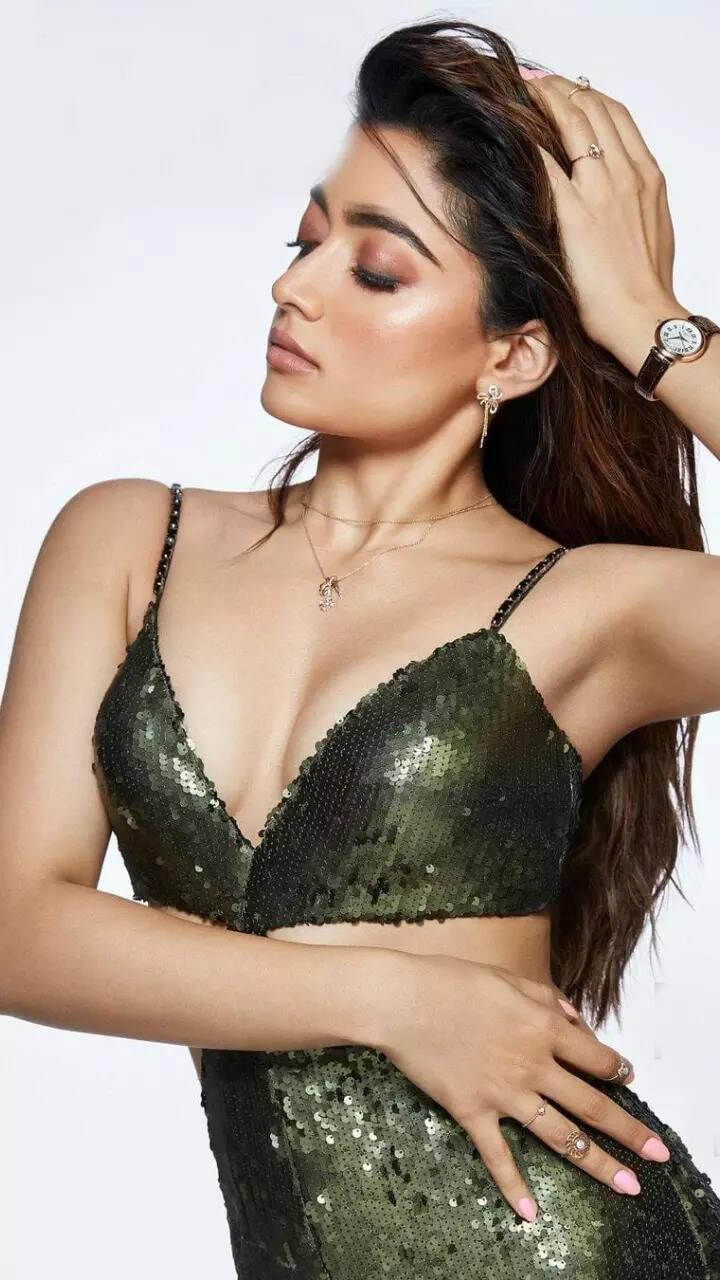 Pushpa actress Rashmika Mandanna pepped up the glam factor in a green shimmery sequin dress.