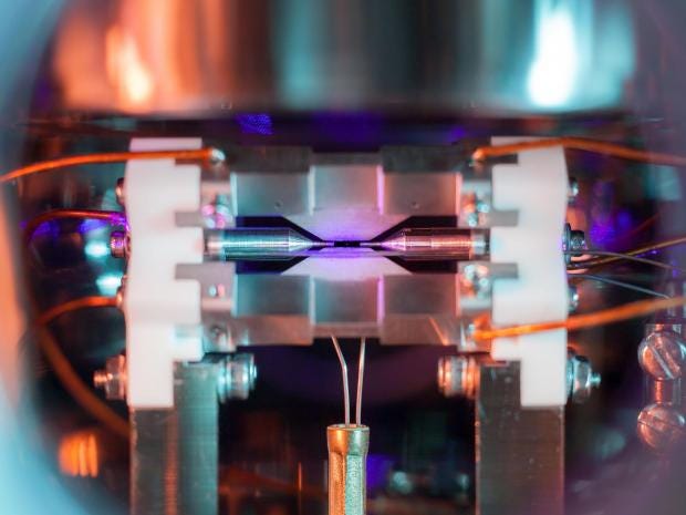 Two metal electrodes, two millimetres apart, held the strontium almost motionless as it was illuminated with a blue-violet-coloured laser.