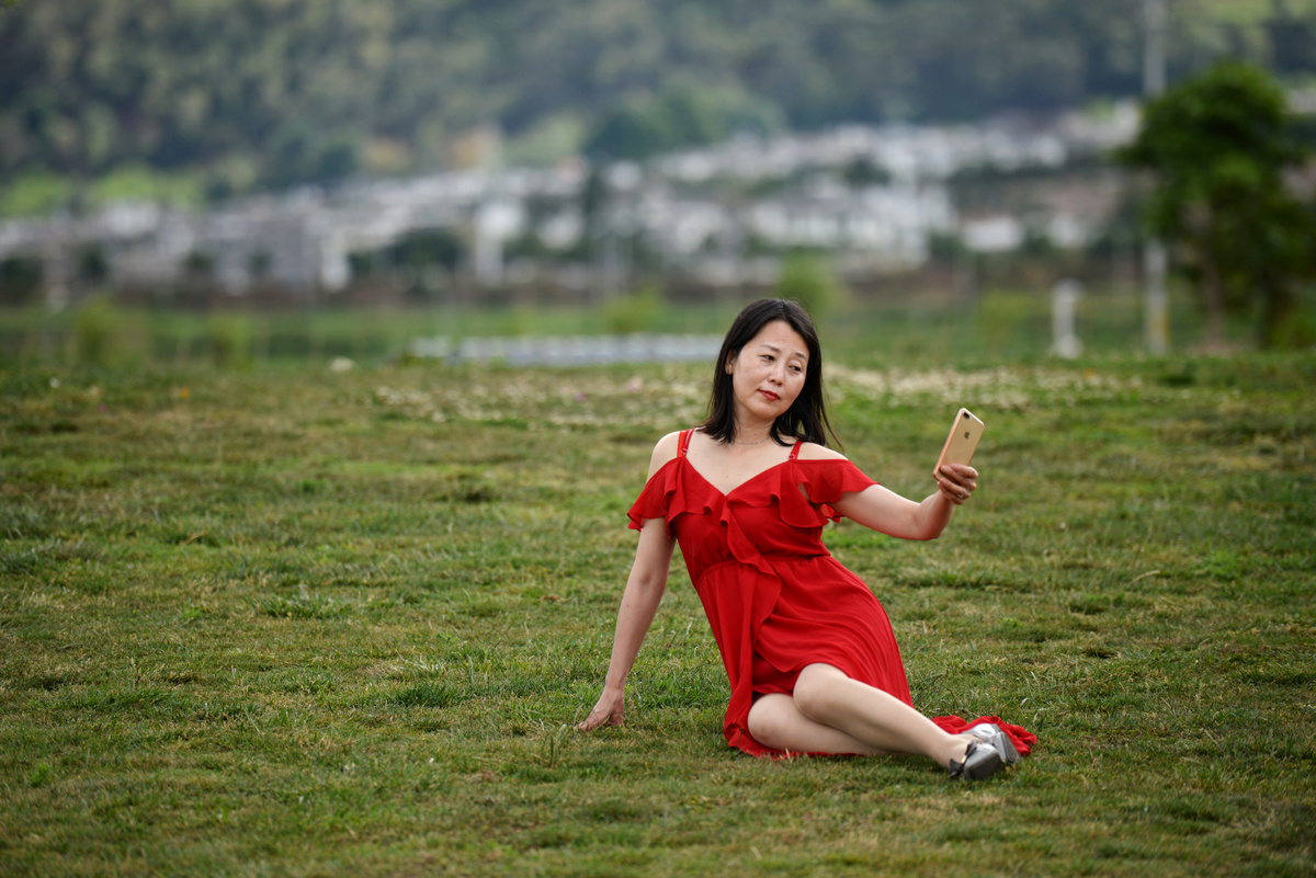 A woman takes selfies with a mobile phone near Erhai Lake in Dali Bai Autonomous Prefecture, Yunnan province, China June 15, 2019. REUTERS/Tingshu Wang